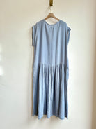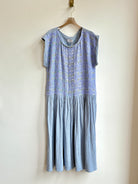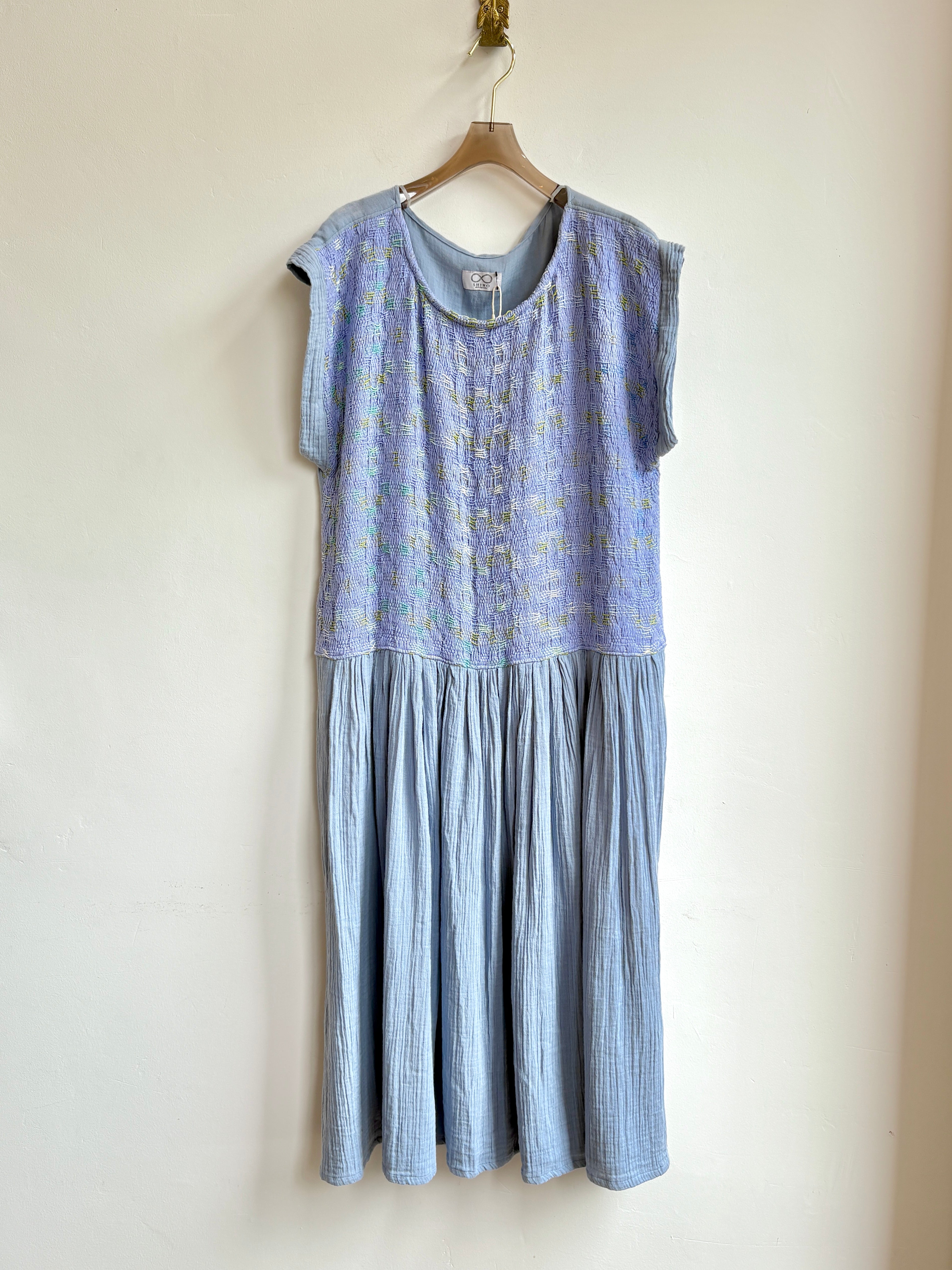 • Handwoven front bodice in lavender and greens, with hydrangea cotton back and skirt