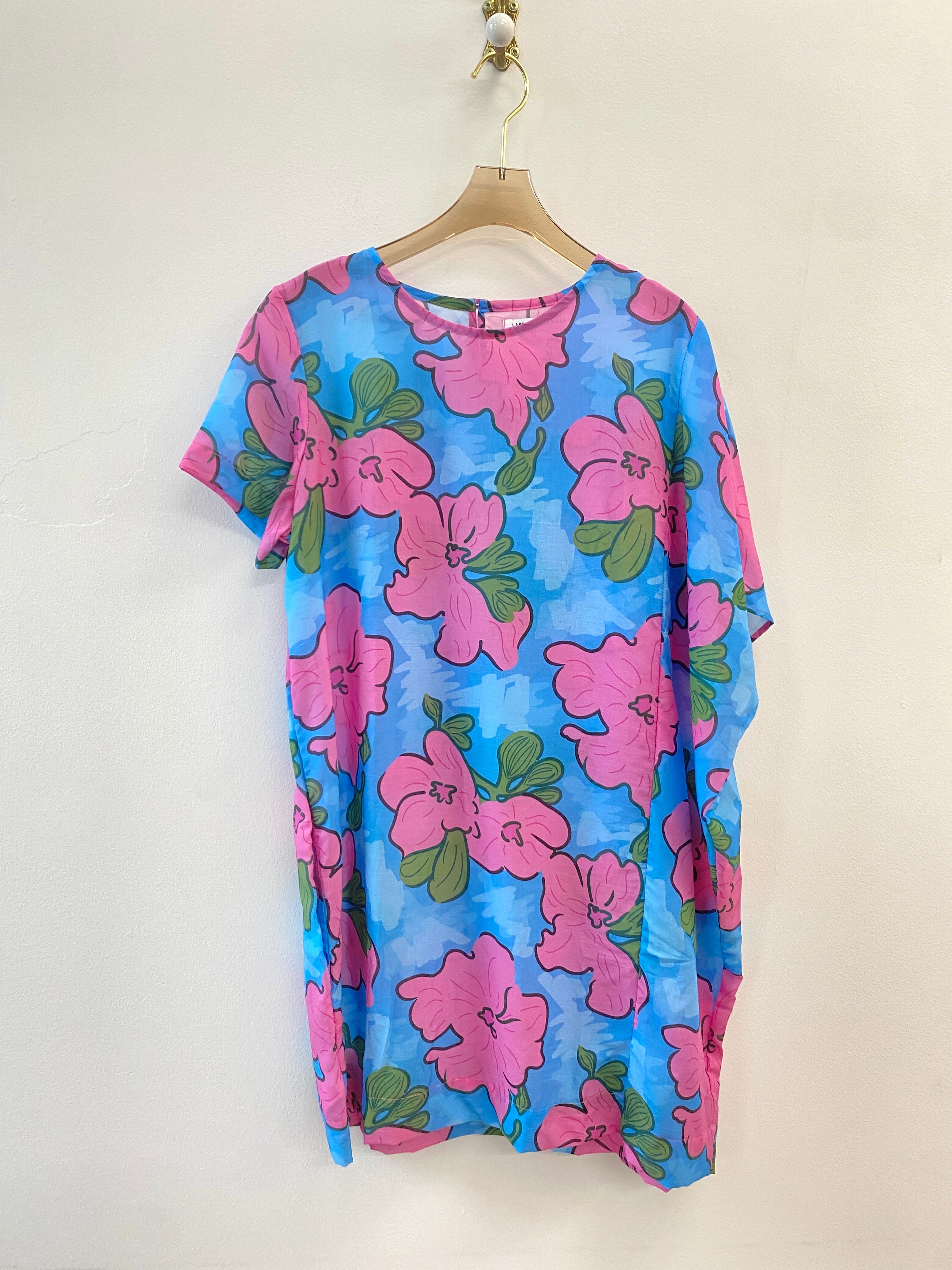 Cleverly shaped kaftan with a crew neck and draped body. Interior finishing Includes flat felled back seam and sewn down facings. Midi length. One size. Created in the most whisper weight cotton voile from Italy. Perhaps the finest we have ever seen.