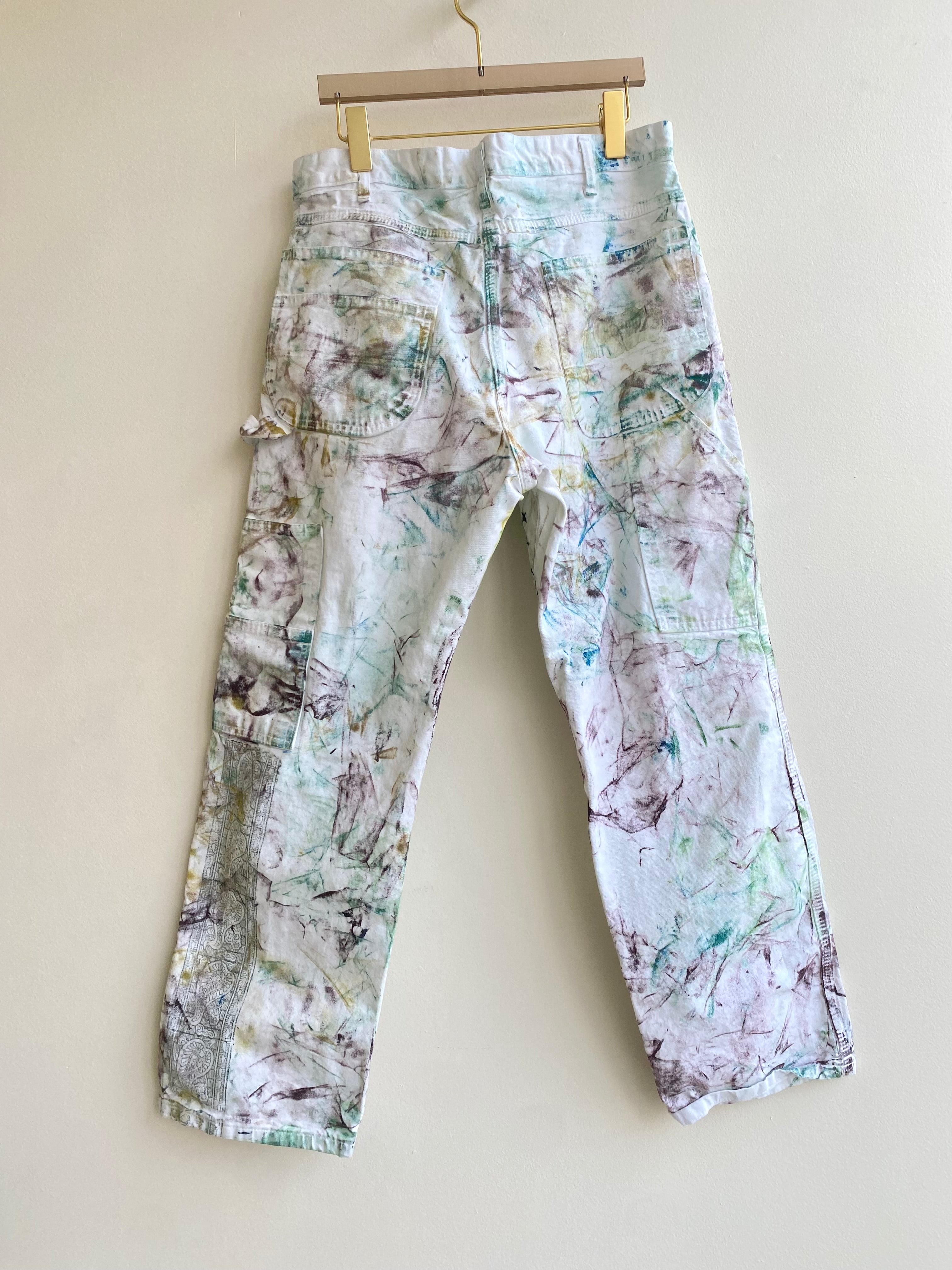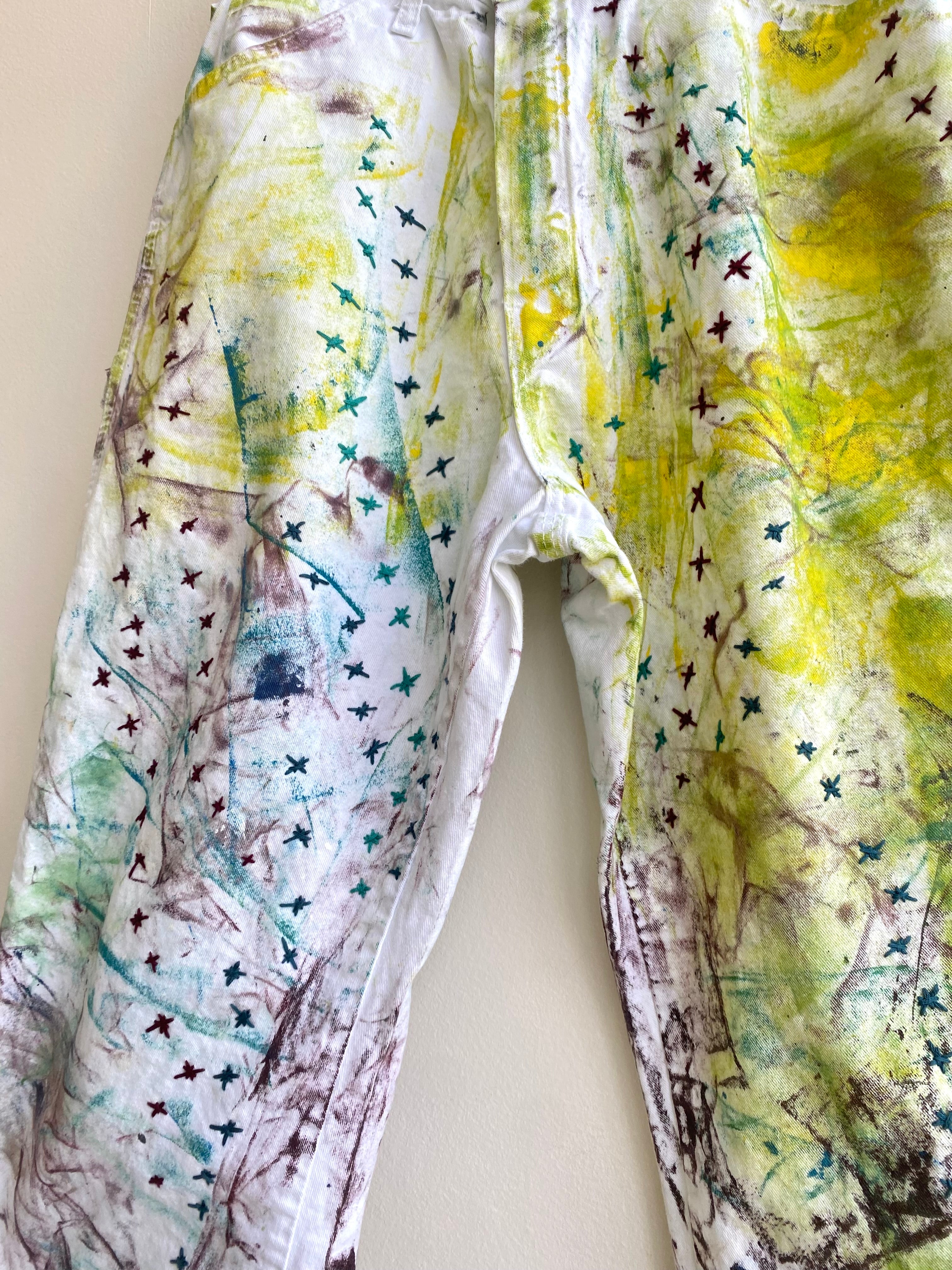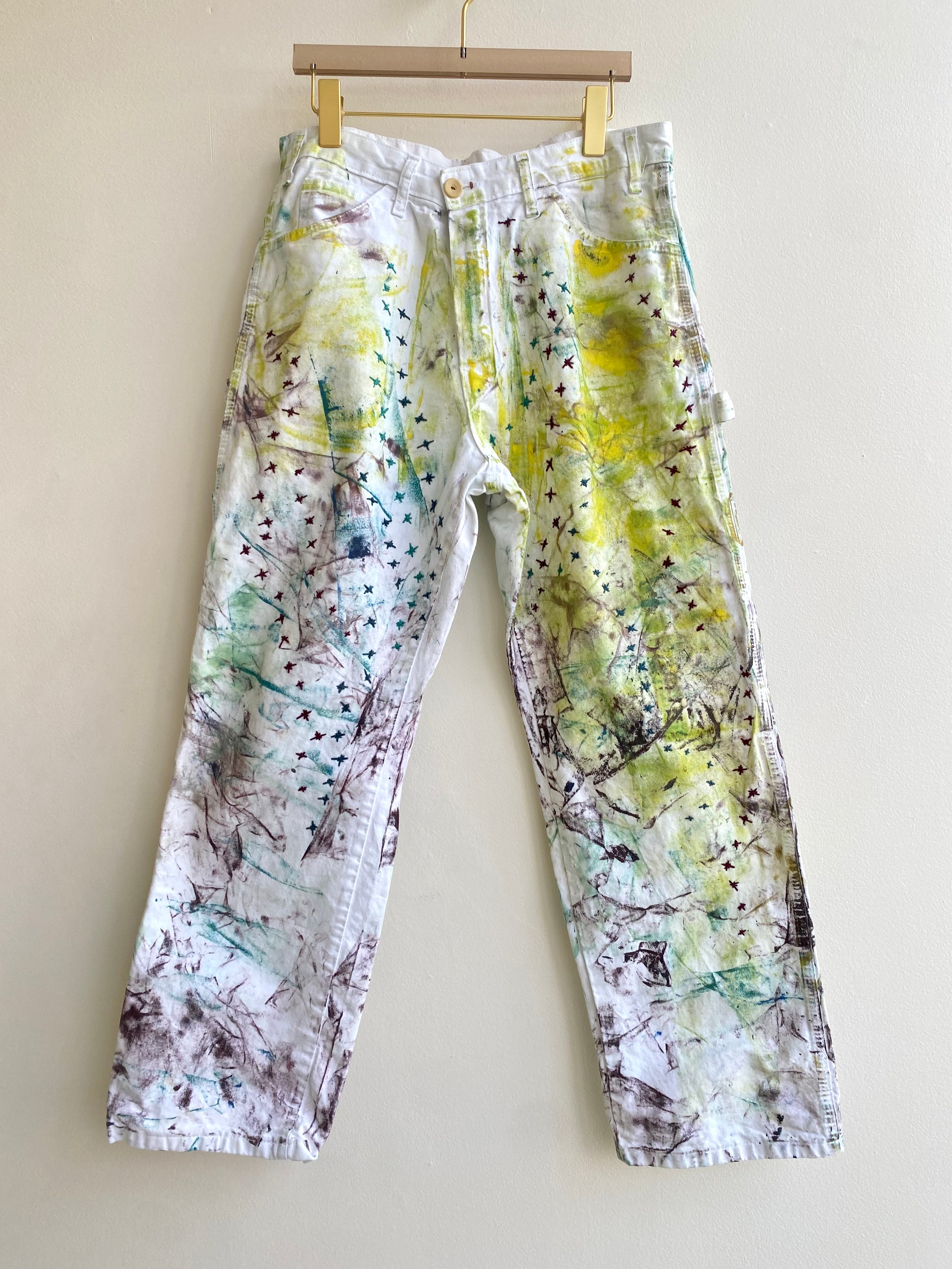 Expertly upcycled by Greene County Wool, these vintage painters pants feature hand embroidered star embroideries in brown & green. Made in Upstate NY, these unique pants add a pop of color and artistic flair to any wardrobe.
