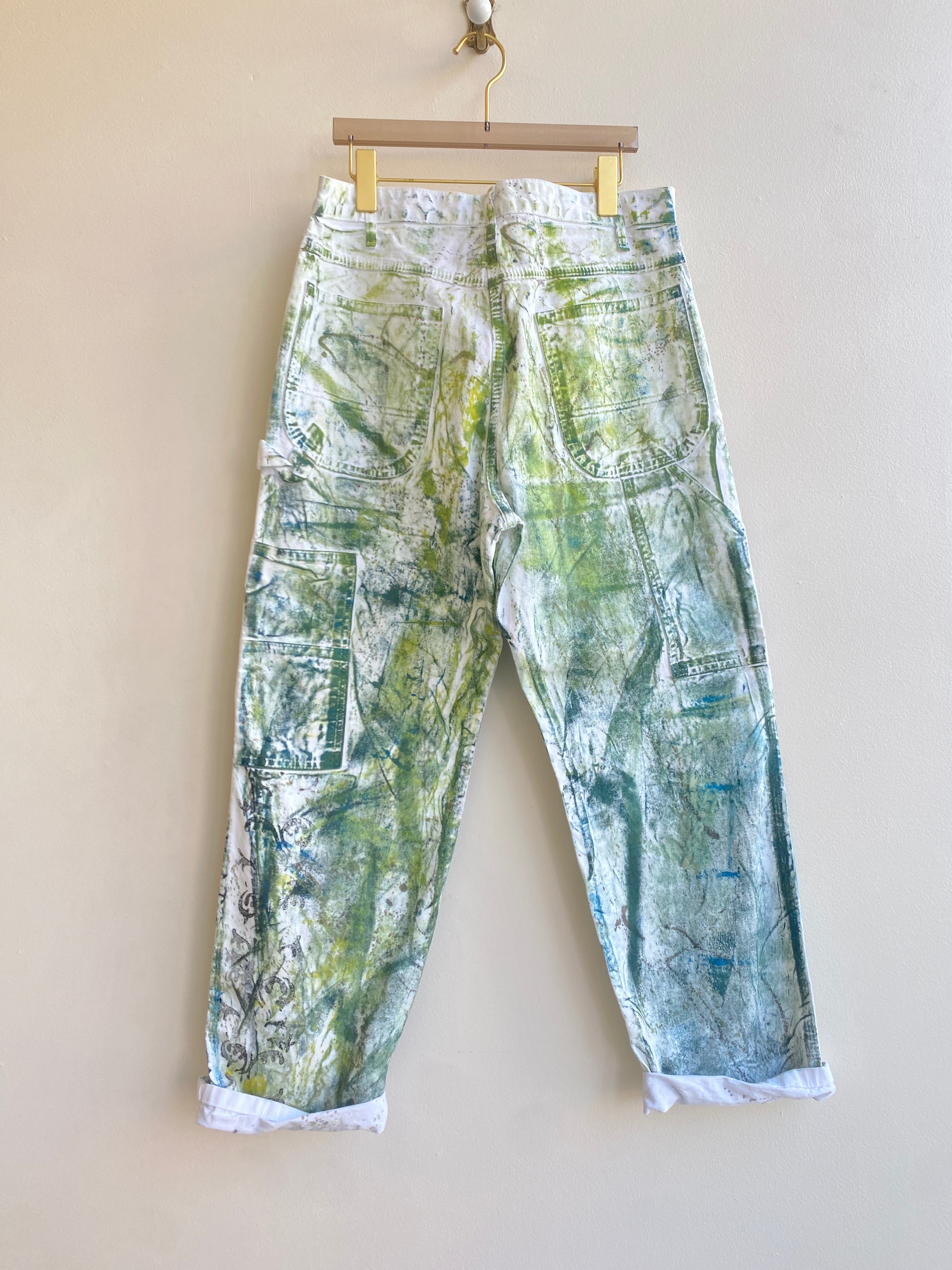 Gender-neutral, hand-embellished painters’ pants with multiple buttons for adjustable fit.