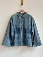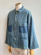 This Olga Ella patchworked denim shirtjacket was once a mere work shirt. It’s been given new life with added denim pockets and lime top stitching.