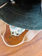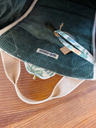 - Lined with deadstock, deep blue-green corduroy