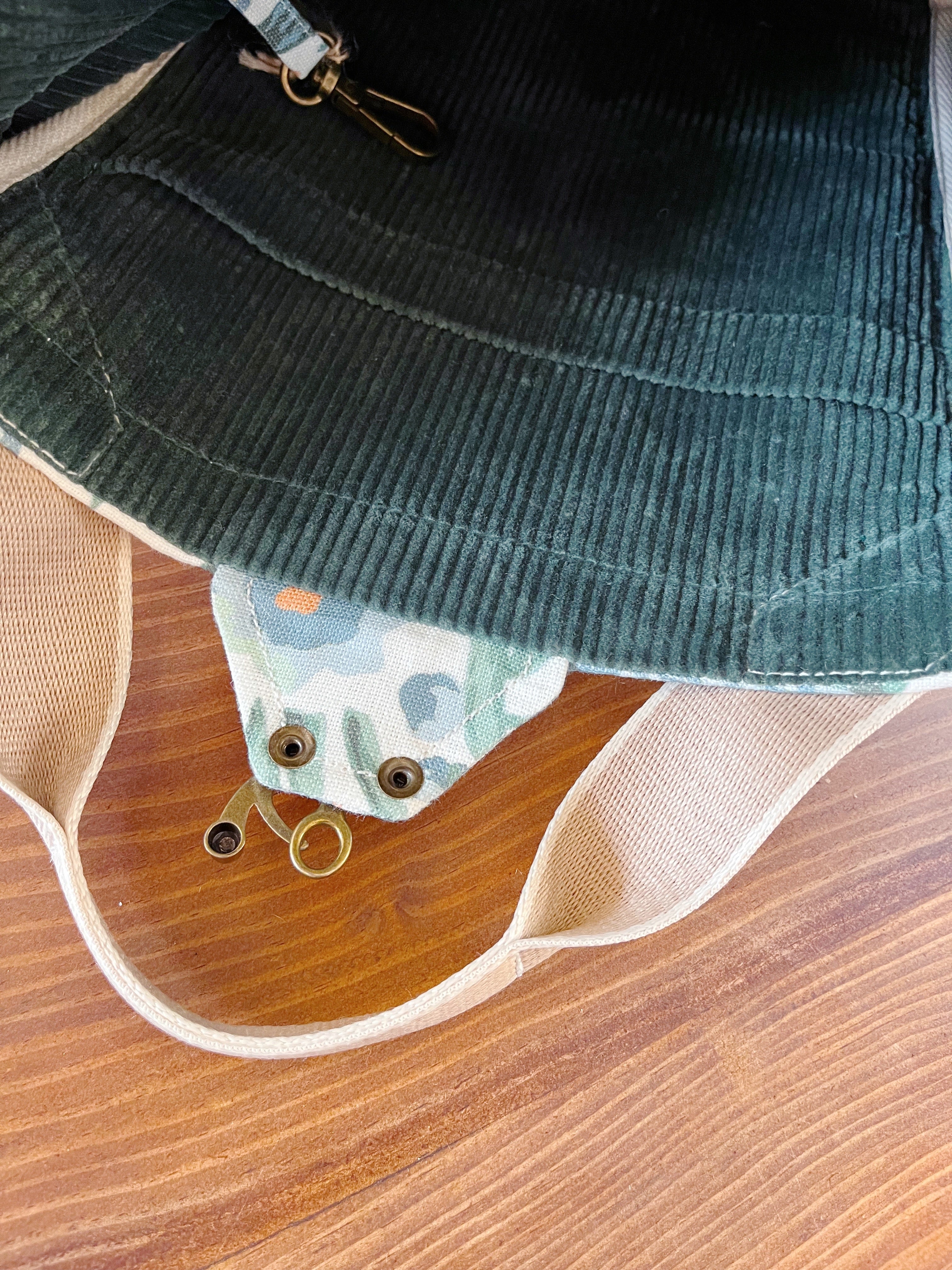 This one is sewn from a sweet fabric printed with flora and fauna in pastel shades, lined with a wide-wale corduroy, and features contrast webbing handles and strap in mushroom with off-white edging.