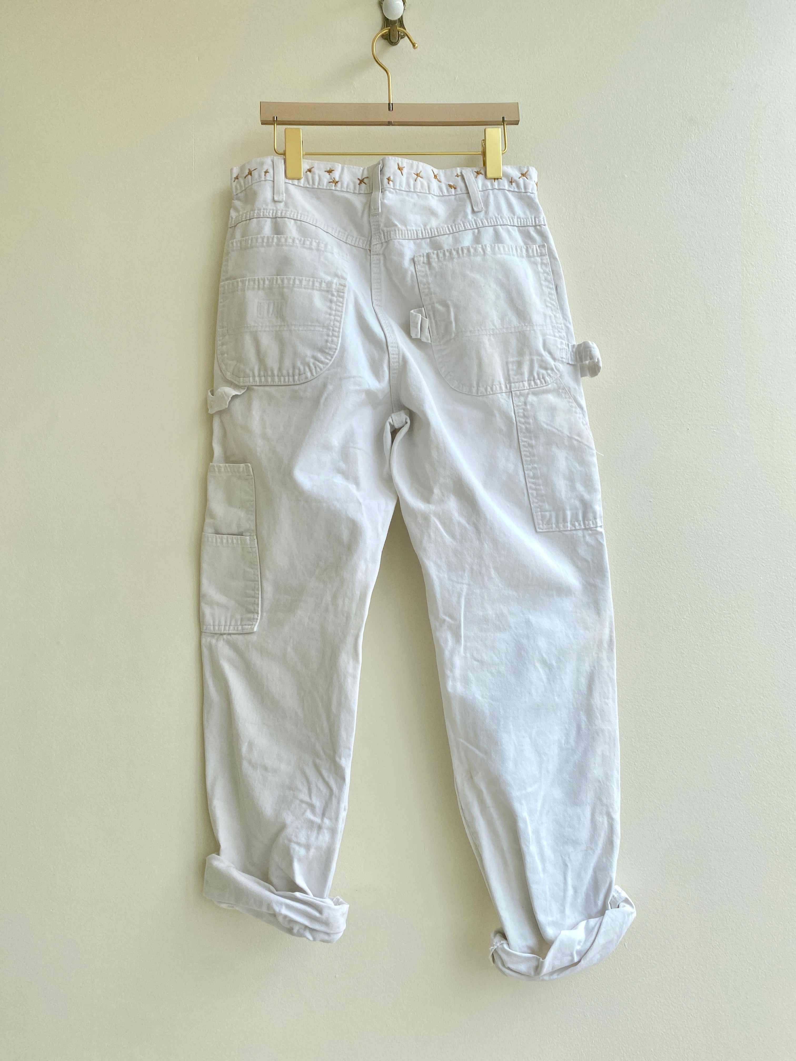 Gender-neutral, hand-embellished painters’ pants with multiple buttons for adjustable fit.