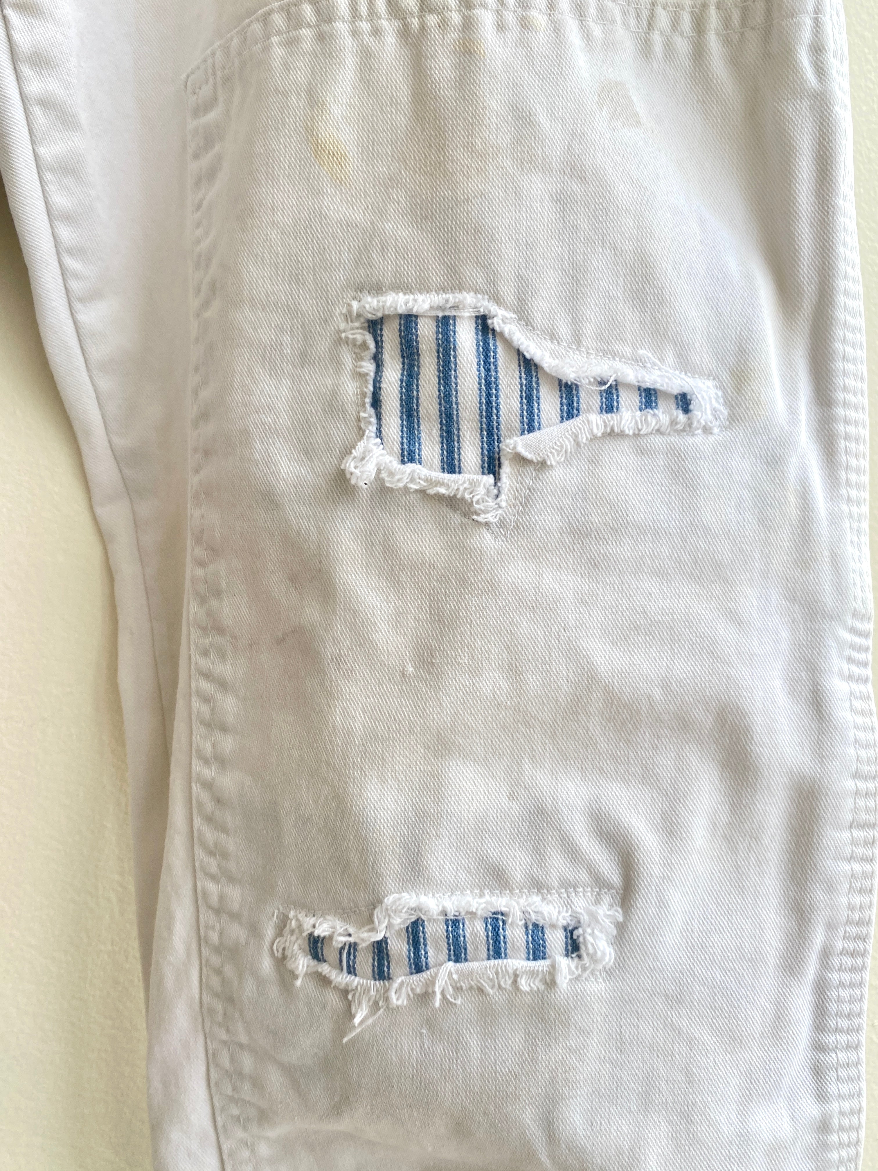 - Hand-embroidered patch in blue and white pinstripe