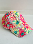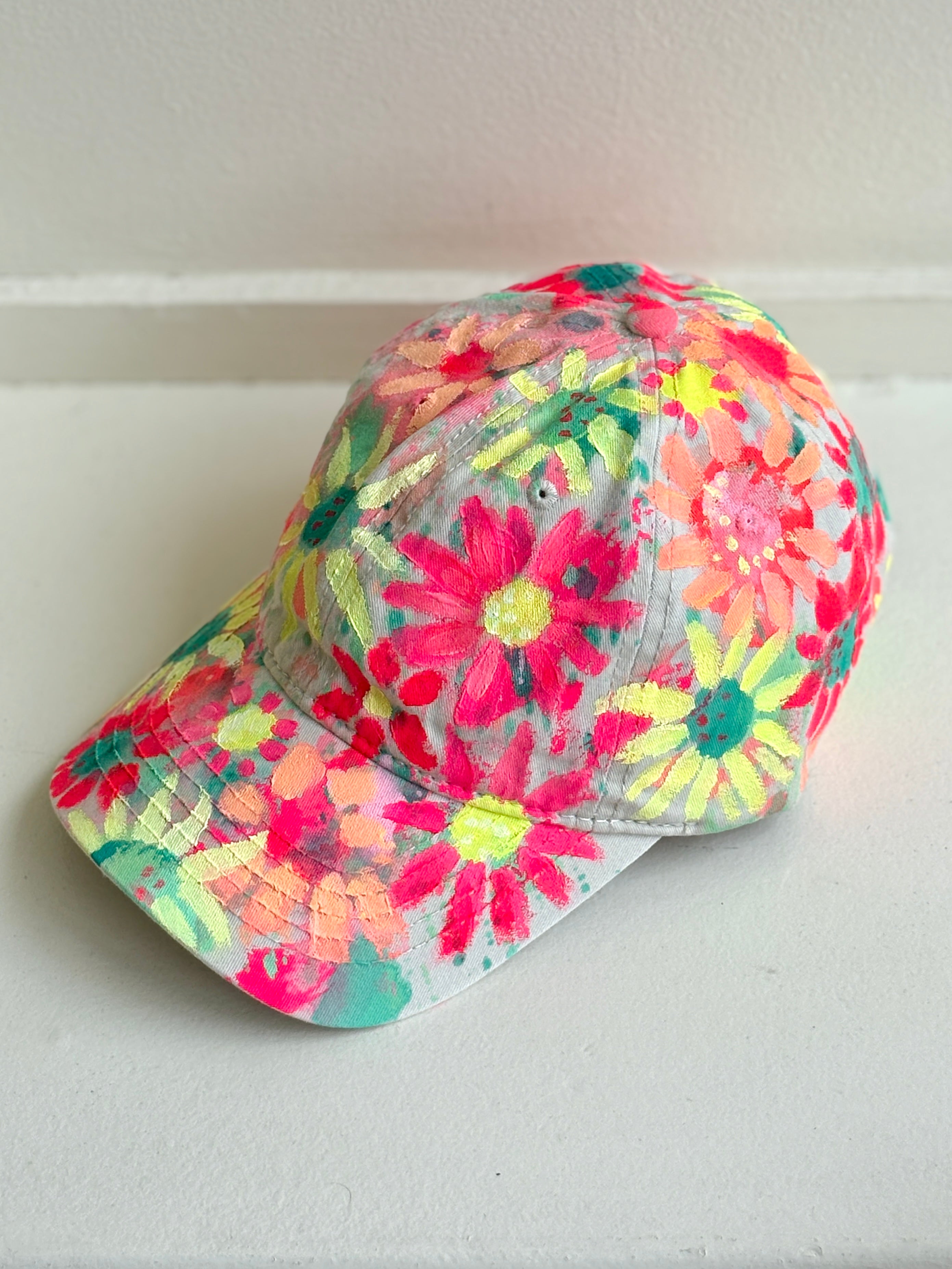 Natural Canvas Hand Painted Neon Pink & Yellow Flowers Baseball Cap