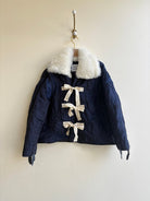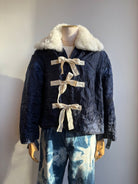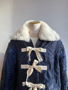 Navy Army Liner Quilted Coat w/ White Alpaca Fur Collar & Twill Tape Ties (Reworked)