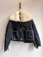 Navy Army Liner Quilted Coat w/ White Alpaca Fur Collar, White Buttons & White Drawstring (Reworked)