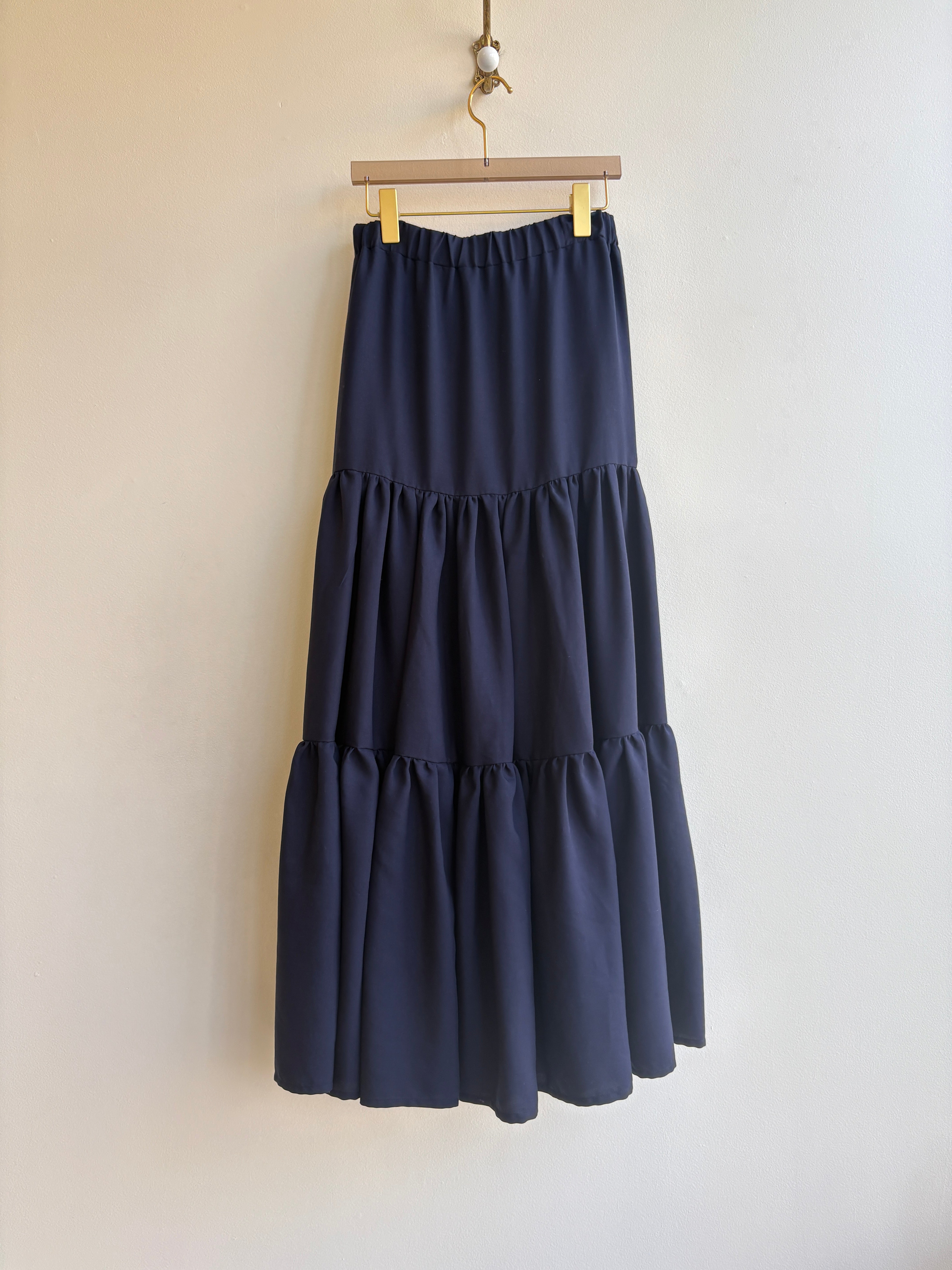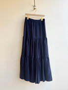 - Full, three-tiered maxi skirt with comfortable elastic waistband
