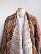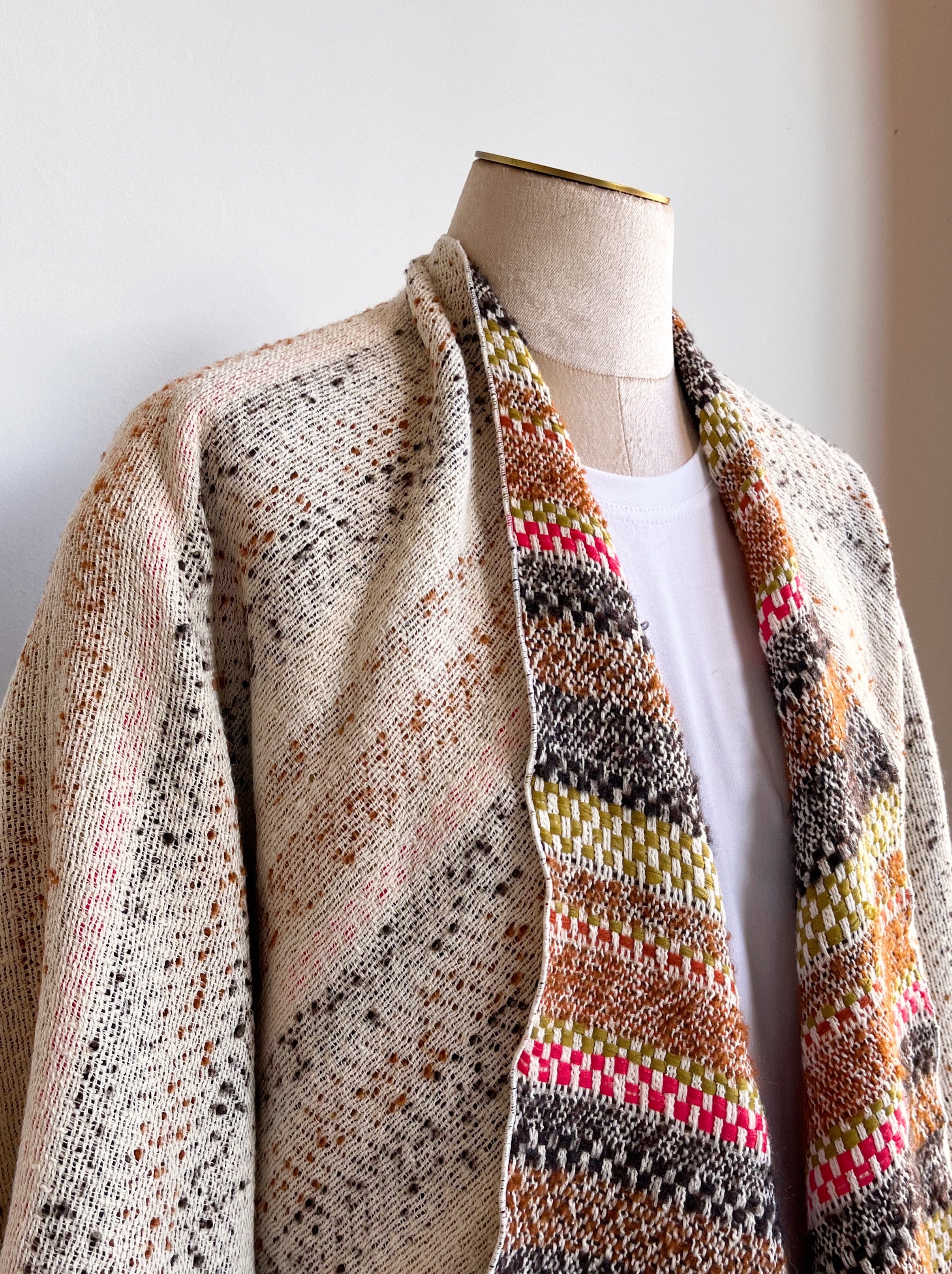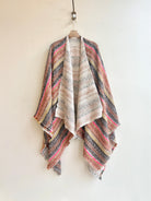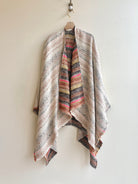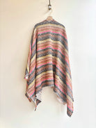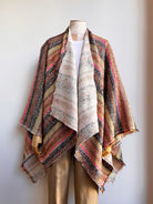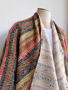 Our extremely versatile Zero-Waste Cape is fully reversible and can be worn with the fronts either flat or folded outwards to show off the contrasting side of the fabric. With this ochre, brown, red, burnt orange stripe blanket knit, one side is more cream ; the reverse side is ochre, brown, red, burnt orange stripe tone for a more fall look.