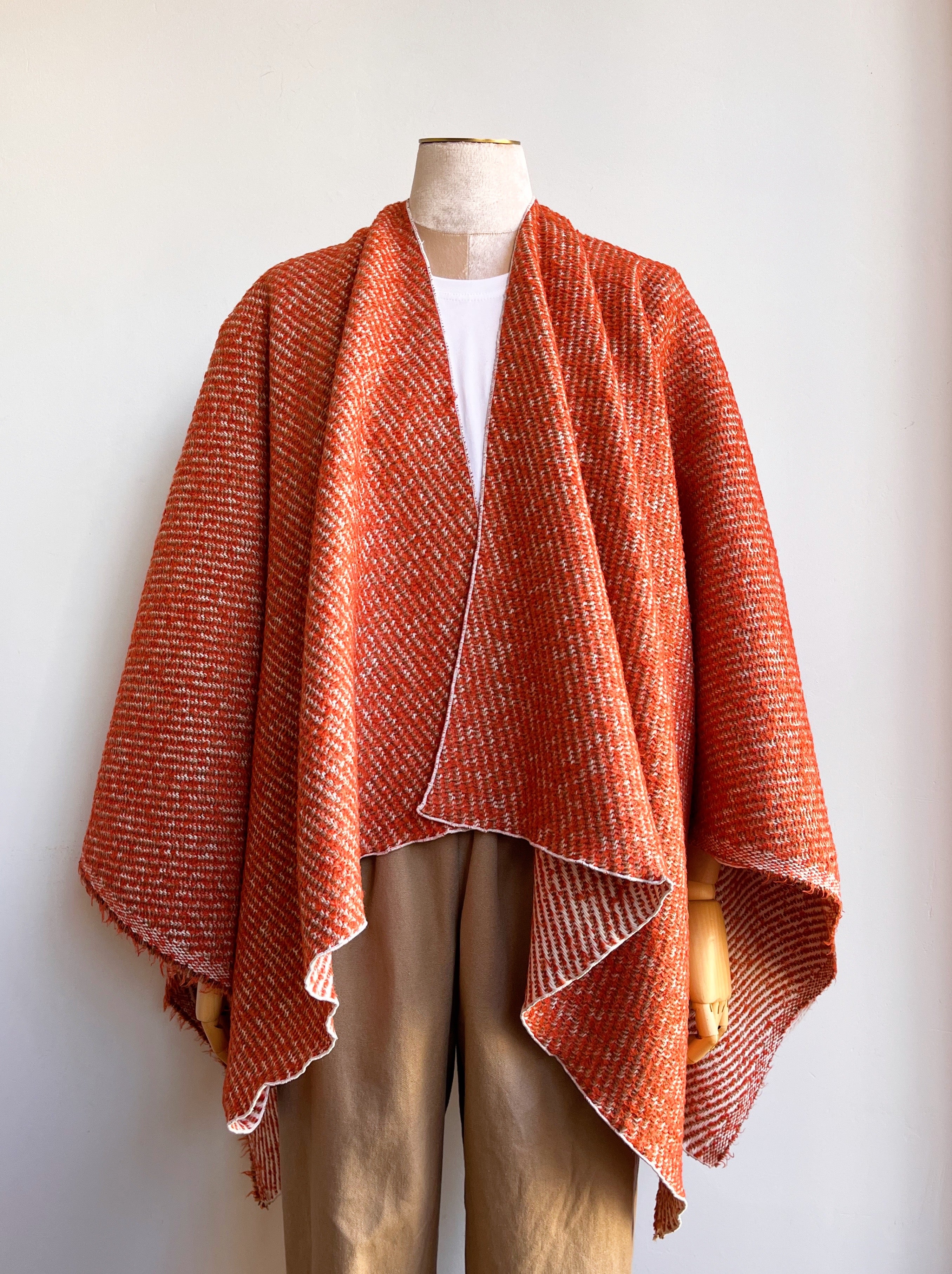 Our extremely versatile Zero-Waste Cape is fully reversible and can be worn with the fronts either flat or folded outwards to show off the contrasting side of the fabric. With this orange and cream deadstock blanket knit, one side is more cream ; the reverse side is darker orange tone for a more fall look.