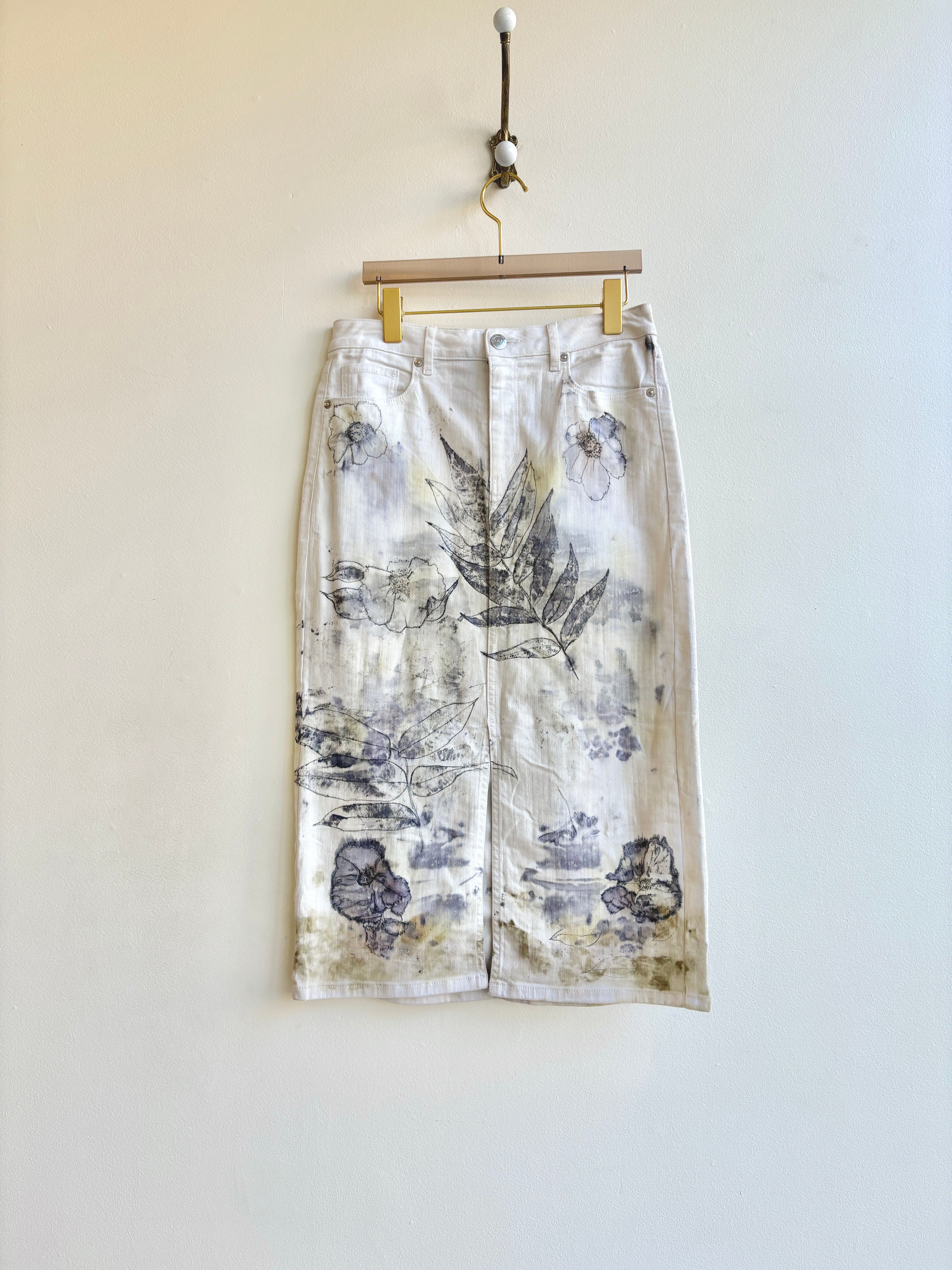 Plum & Green Denim Long Eco-Printed & Hand Drawn Skirt (Reworked)