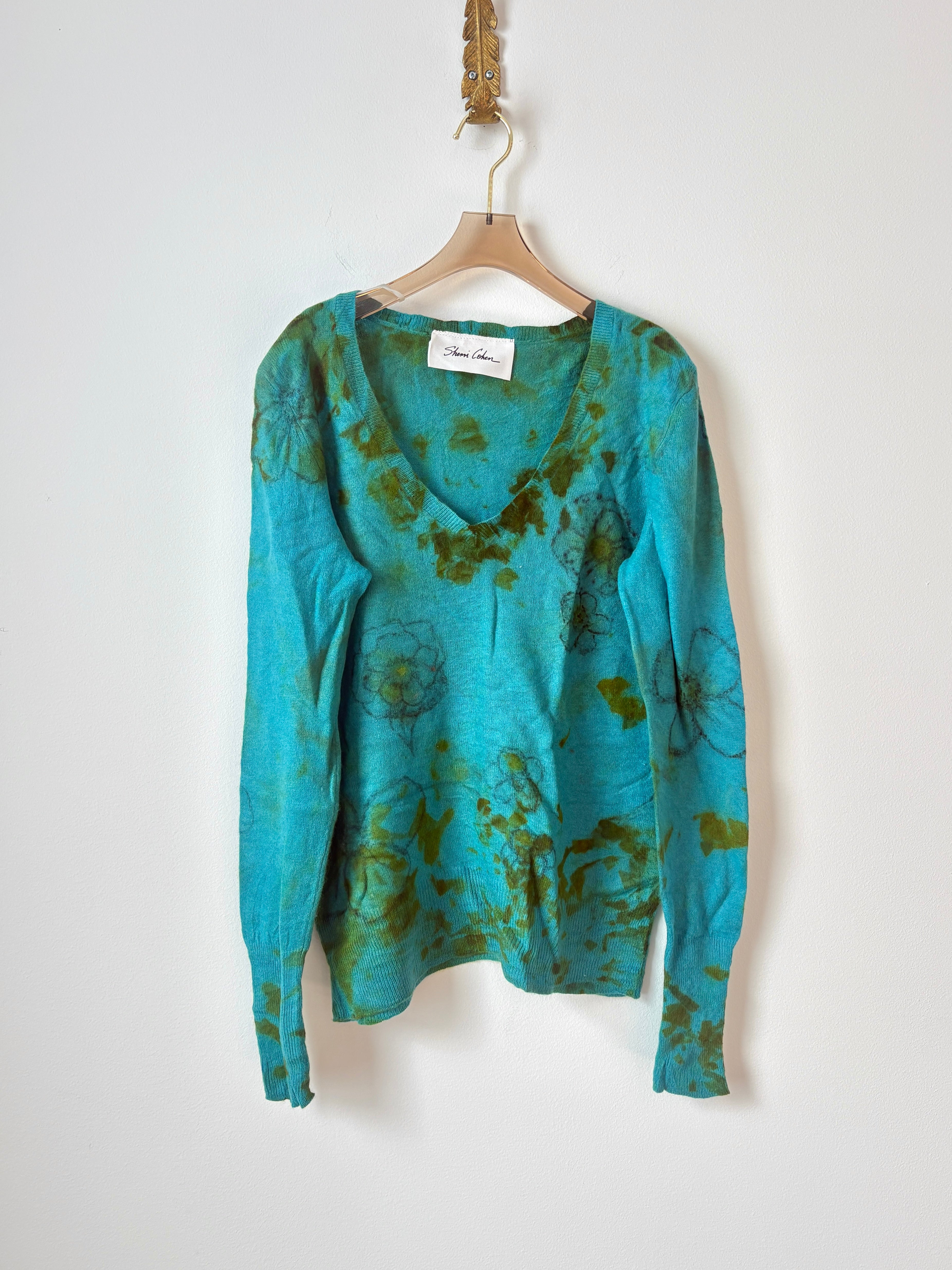 This eco-printed sweater is a cozy, one-of-a-kind piece, upcycled by Sherri Cohen Design. This v-neck sweater is a warm cashmere knit. Painted with leaves and flowers resulting in delicate, organic impressions that connect you to the earth.