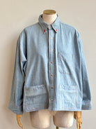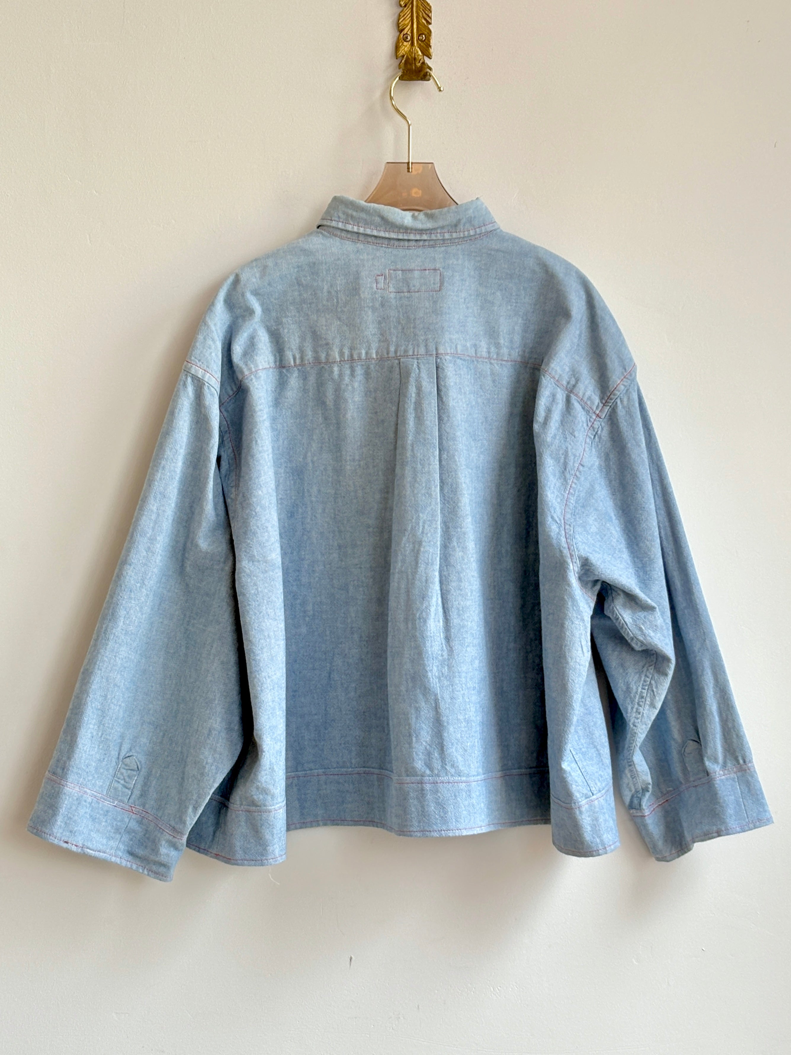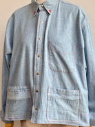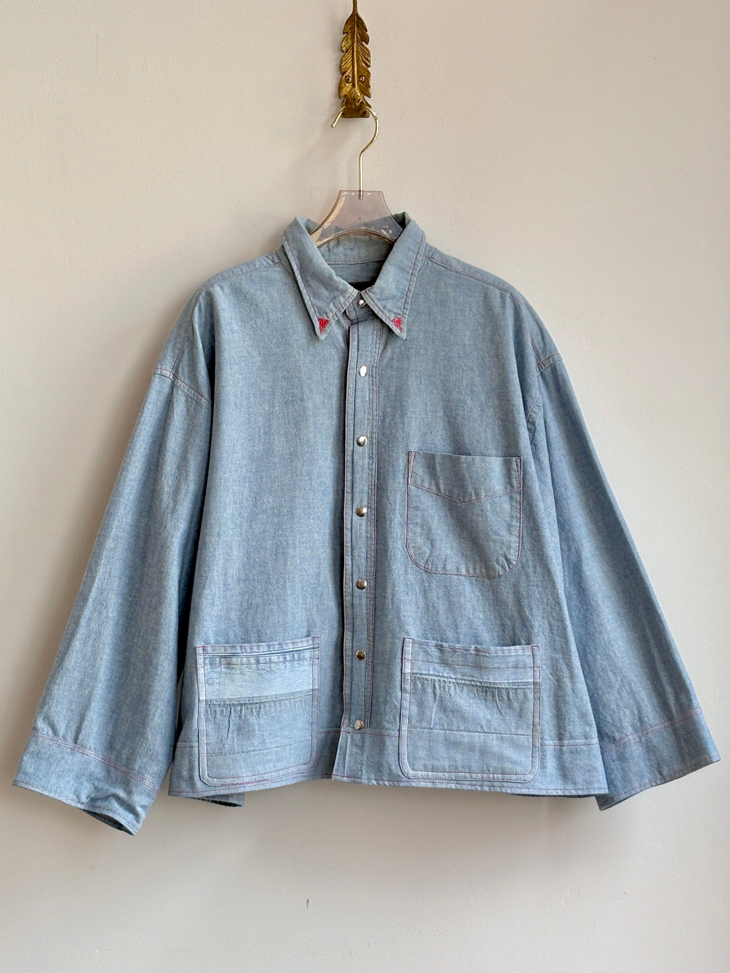 This Olga Ella patchworked denim shirtjacket was once a mere work shirt. It’s been given new life with a straight hem and added denim pockets with red top stitching