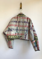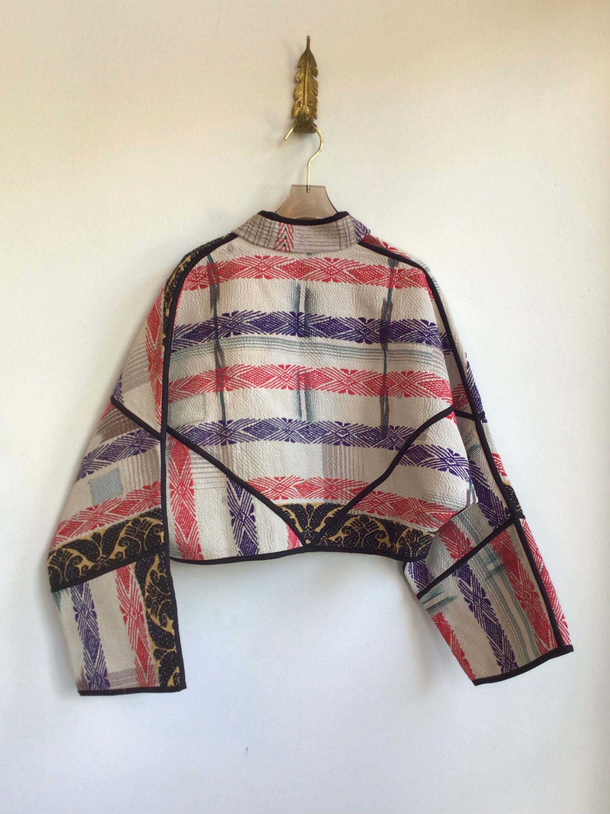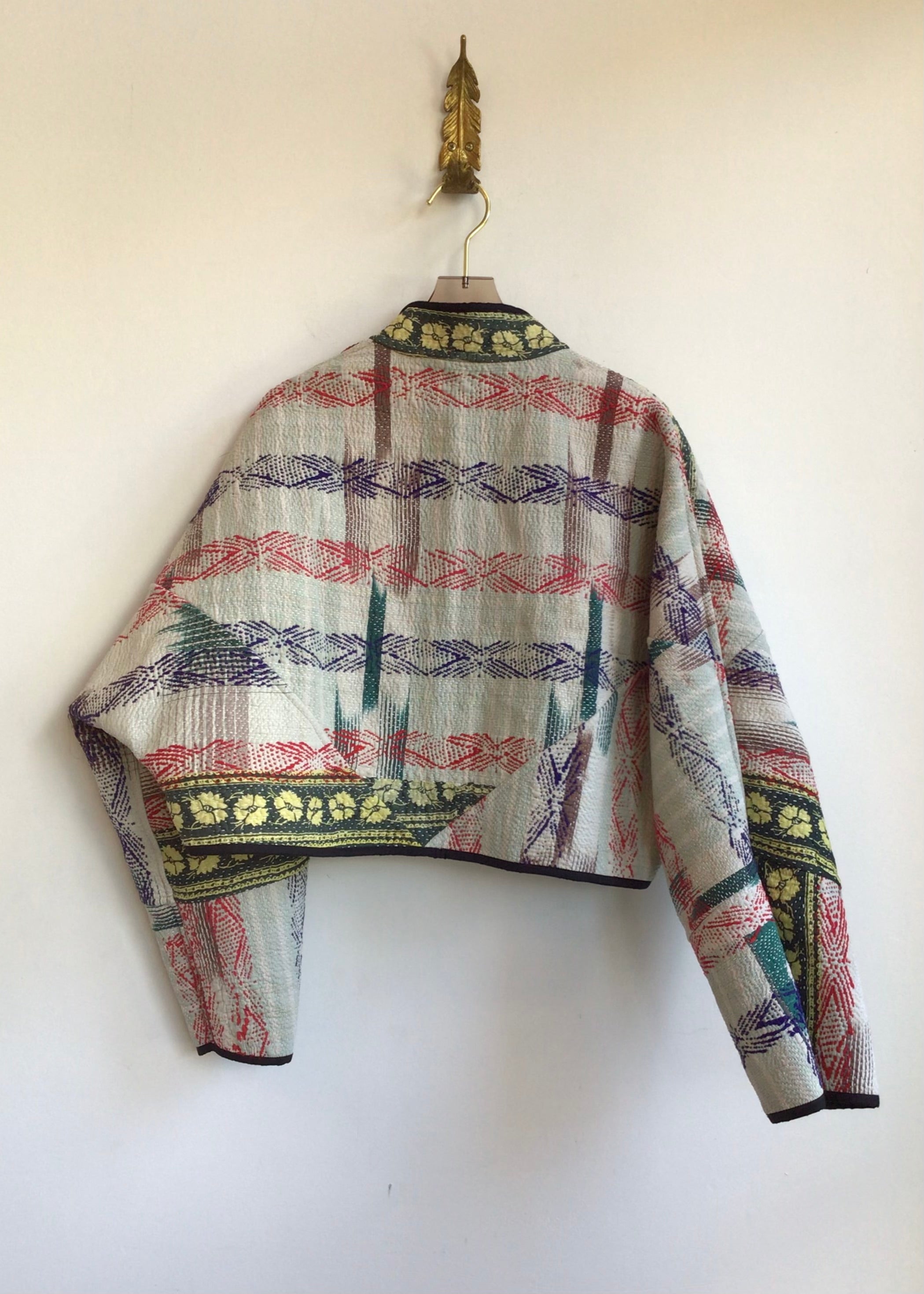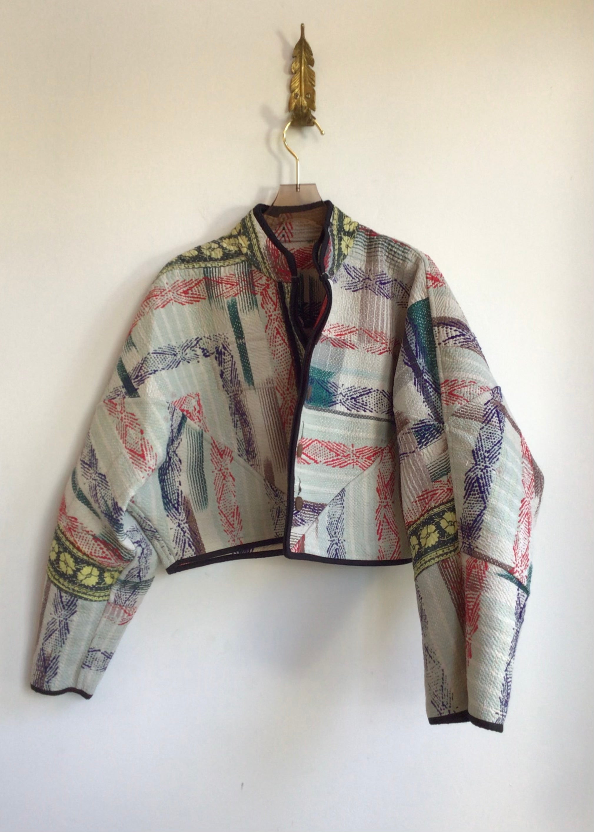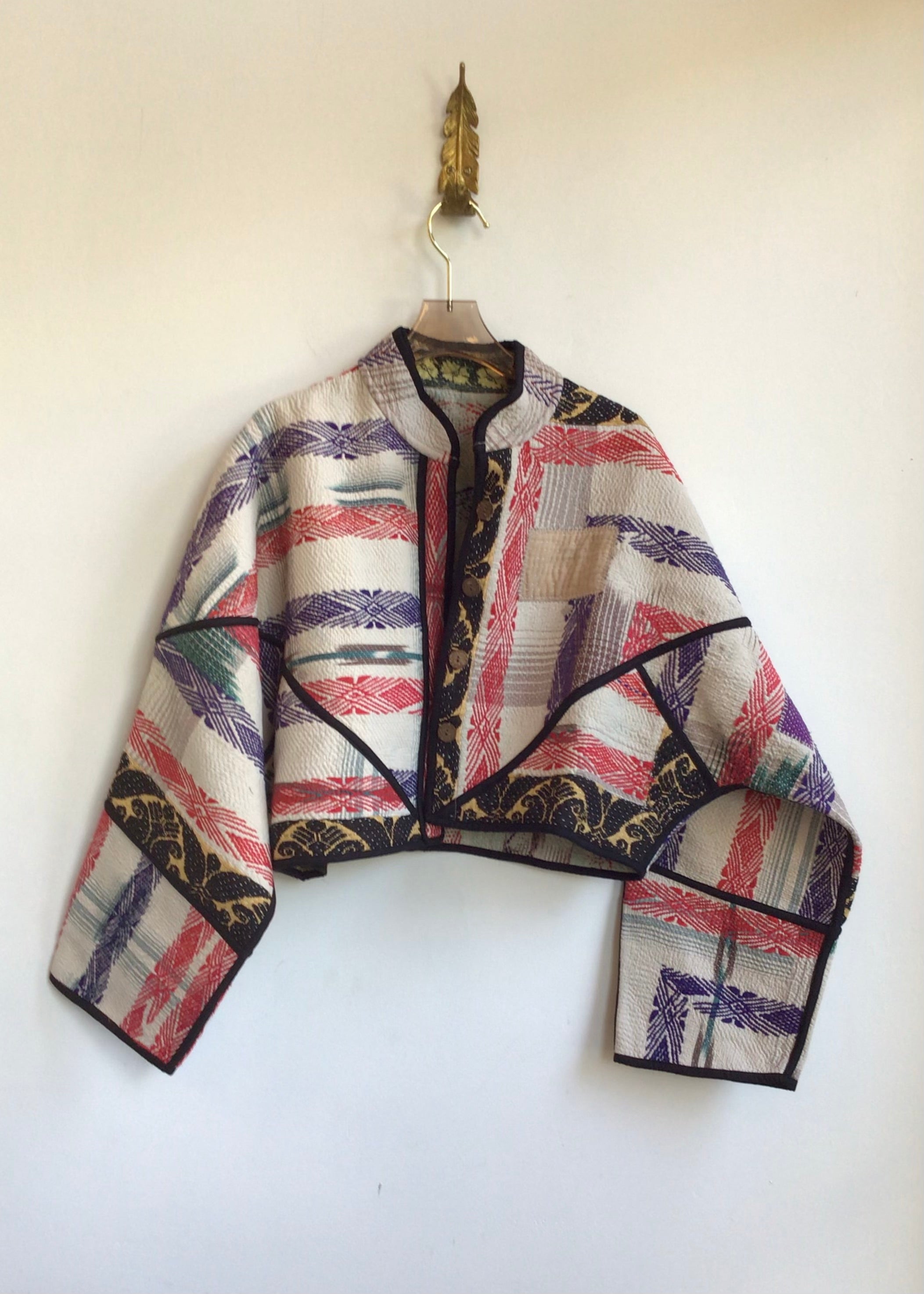 The Kaira Cropped Jacket is made from repurposed Vintage Kantha quilts, and the original patina includes areas of fraying, patches and an age-softened feel.