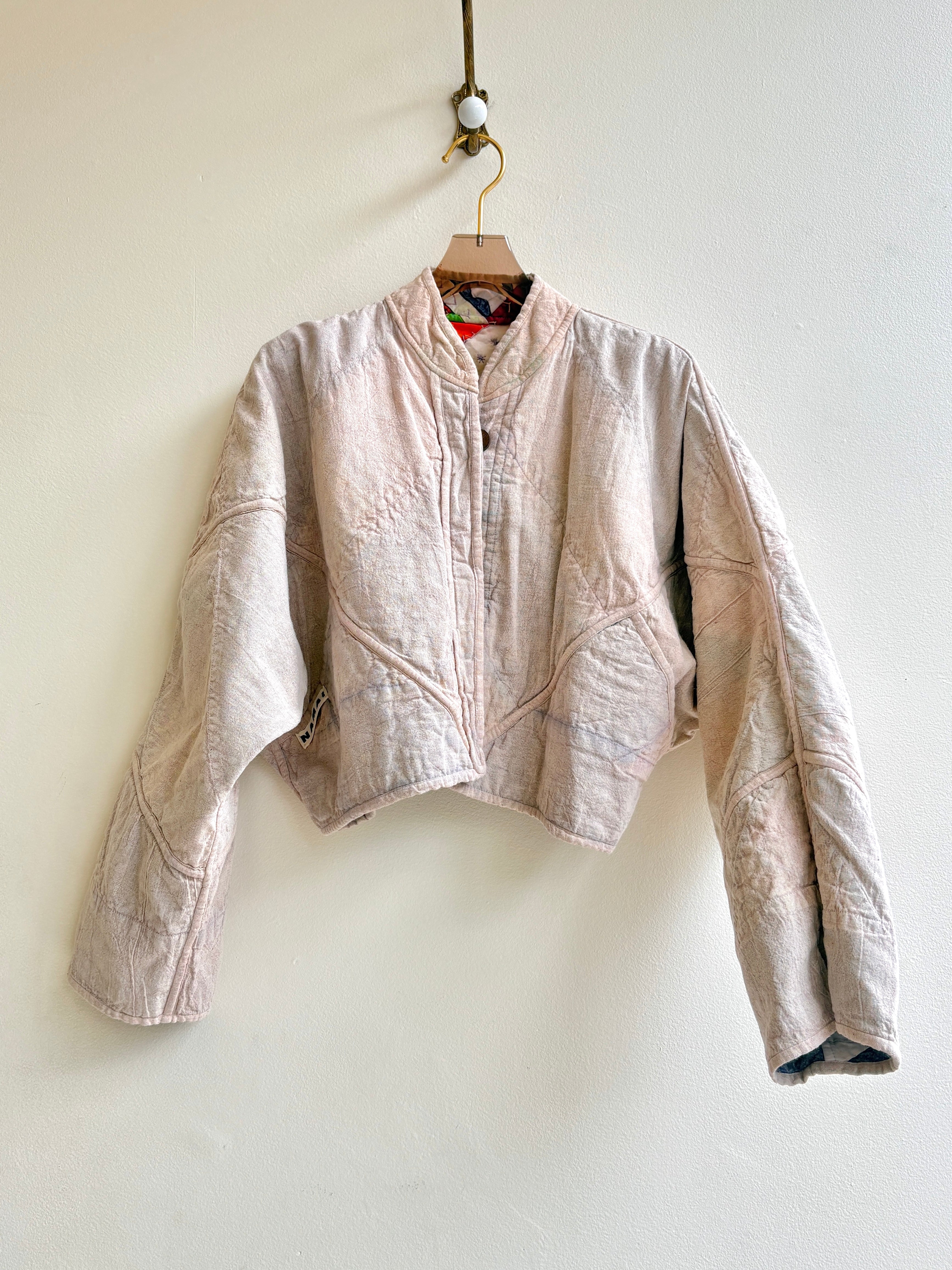 The Suzani Cropped Jacket is made from repurposed Vintage Kantha quilts, and the original patina includes areas of fraying, patches and an age-softened feel.