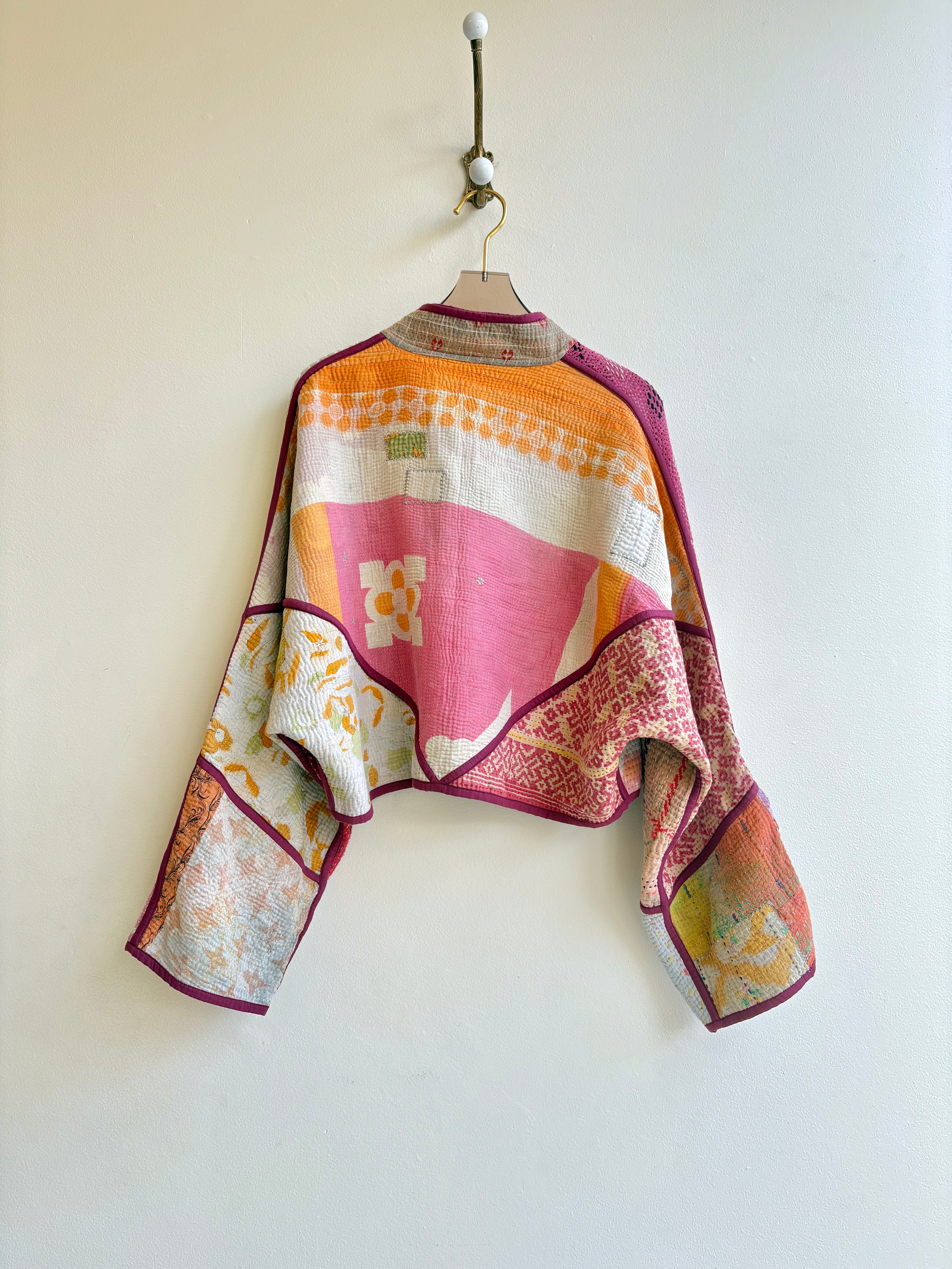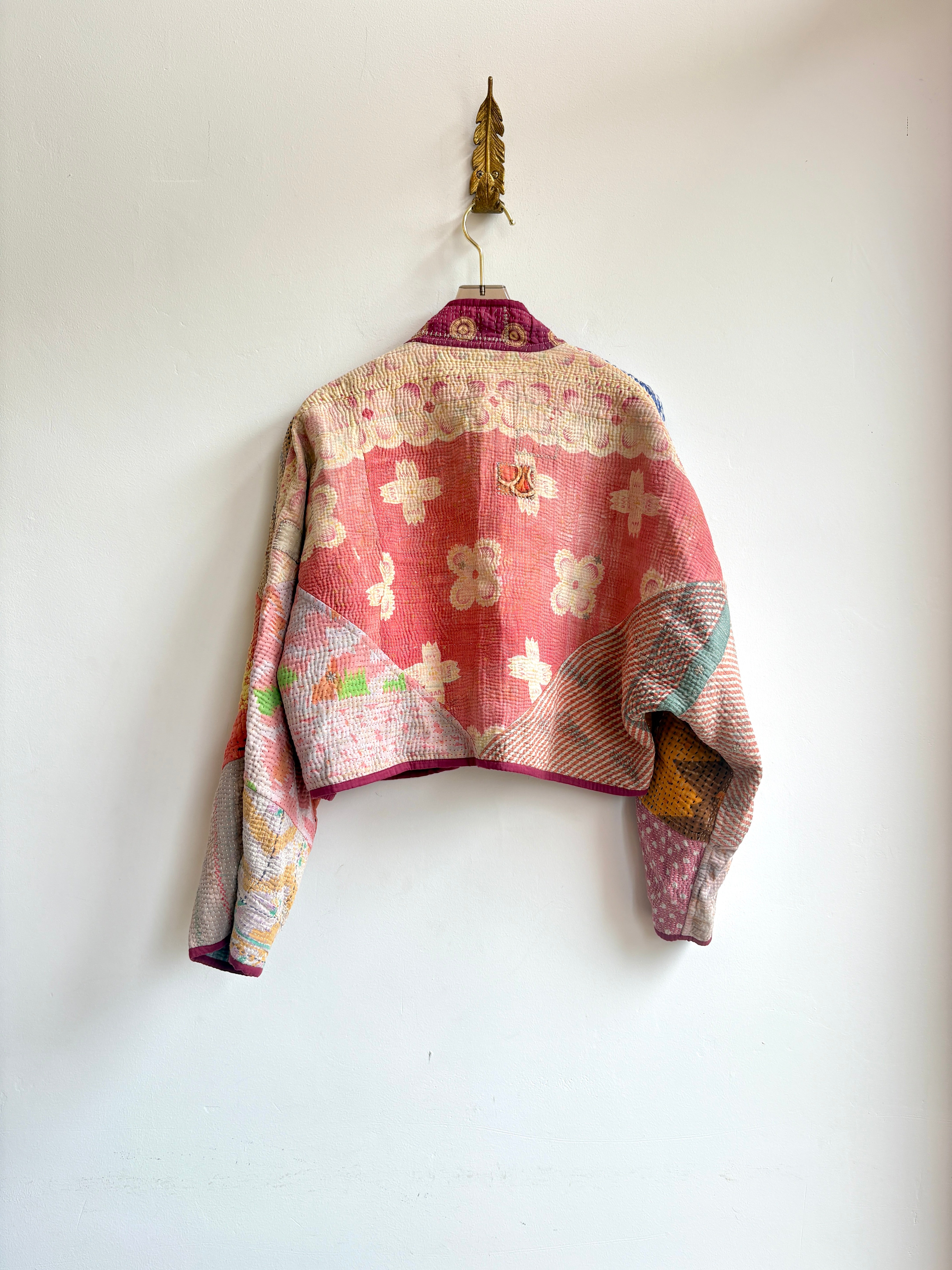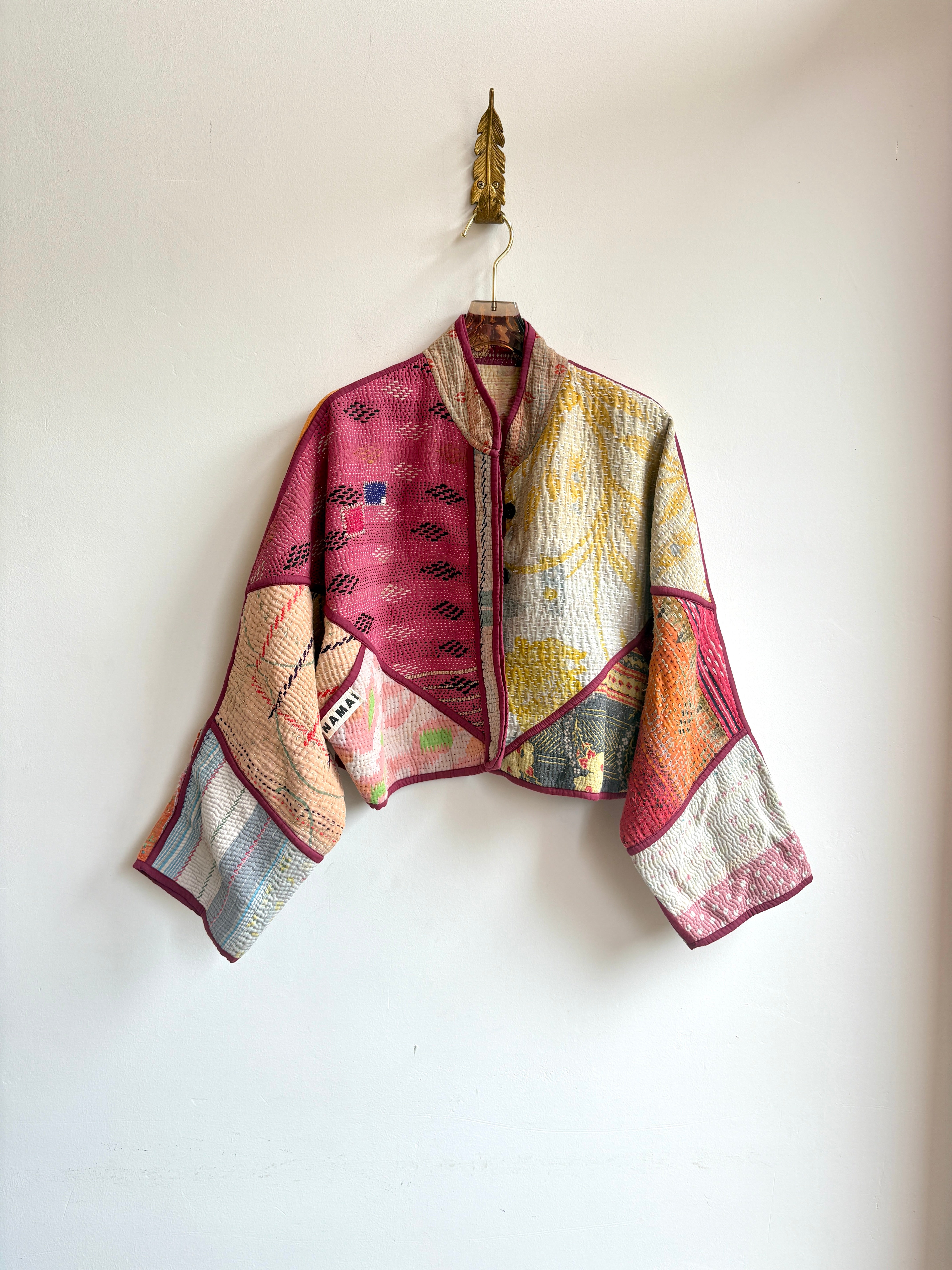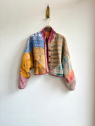 The Kaira Cropped Jacket is made from repurposed Vintage Kantha quilts, and the original patina includes areas of fraying, patches and an age-softened feel.