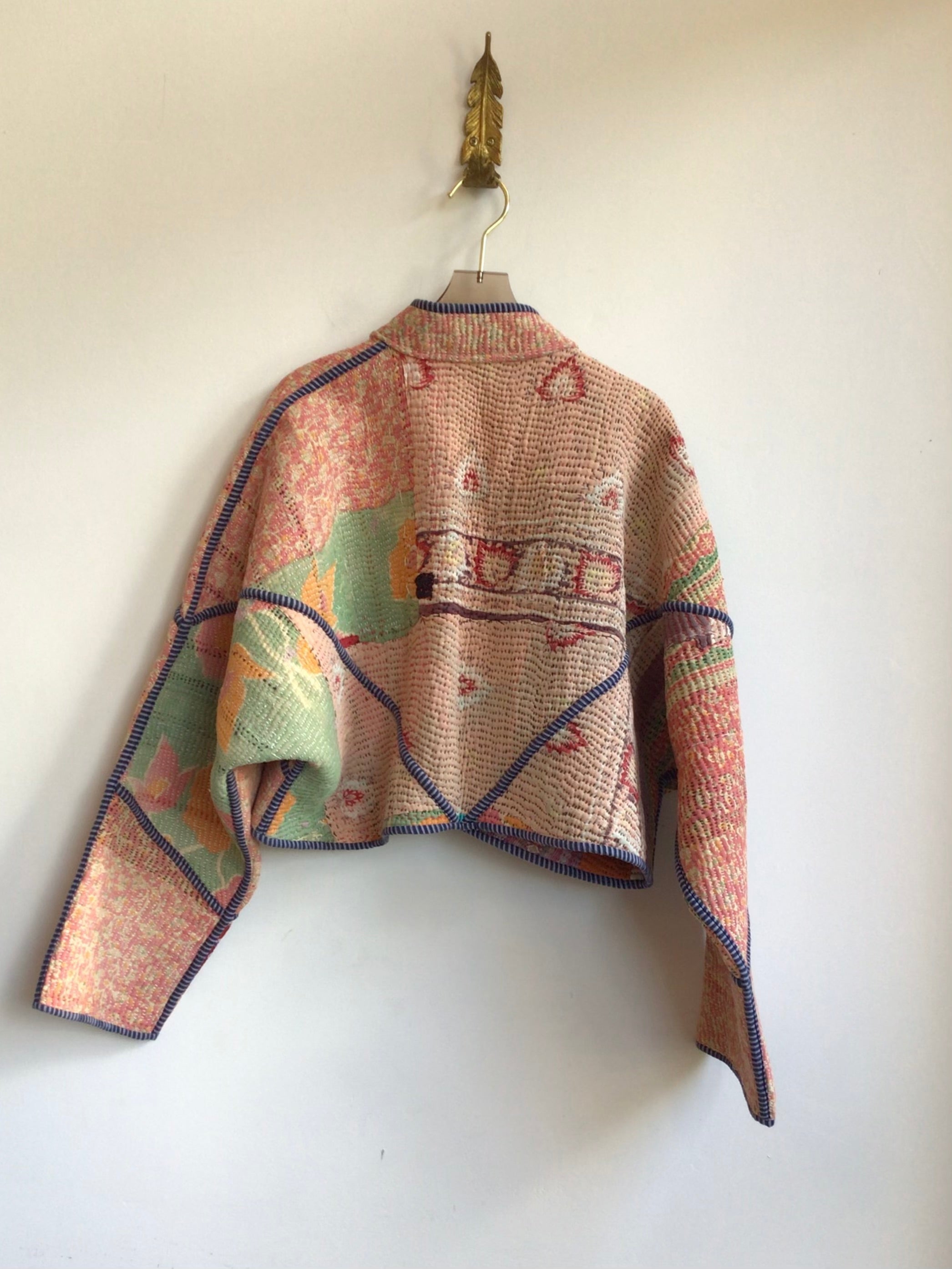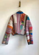 The Kaira Cropped Jacket is made from repurposed Vintage Kantha quilts, and the original patina includes areas of fraying, patches and an age-softened feel.