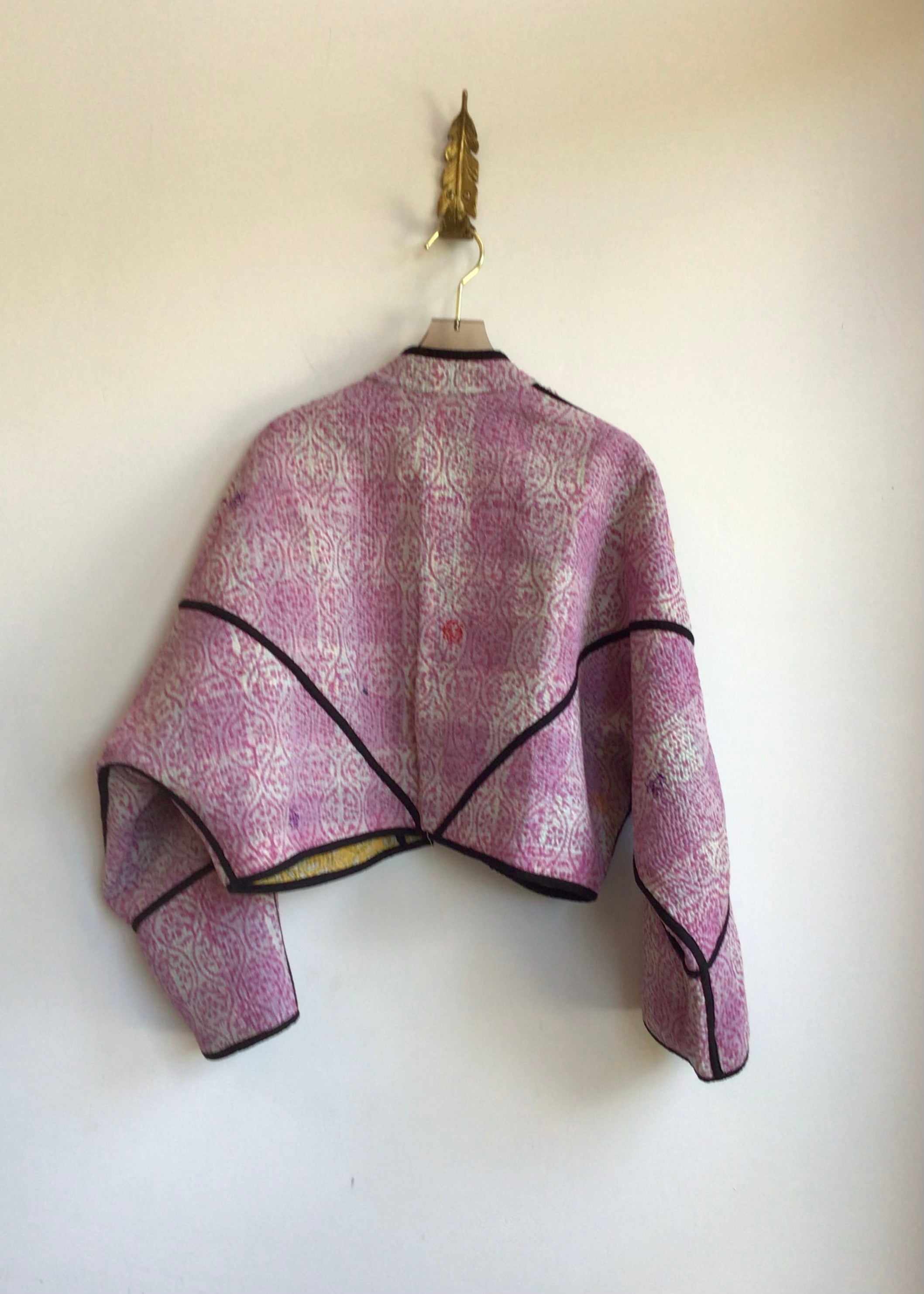 The Kaira Cropped Jacket is made from repurposed Vintage Kantha quilts, and the original patina includes areas of fraying, patches and an age-softened feel.