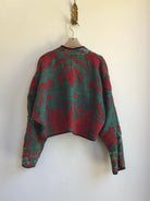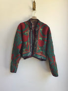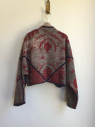 The Kaira Suzani Cropped Jacket is made from repurposed Vintage Kantha quilts, and the original patina includes areas of fraying, patches and an age-softened feel.
