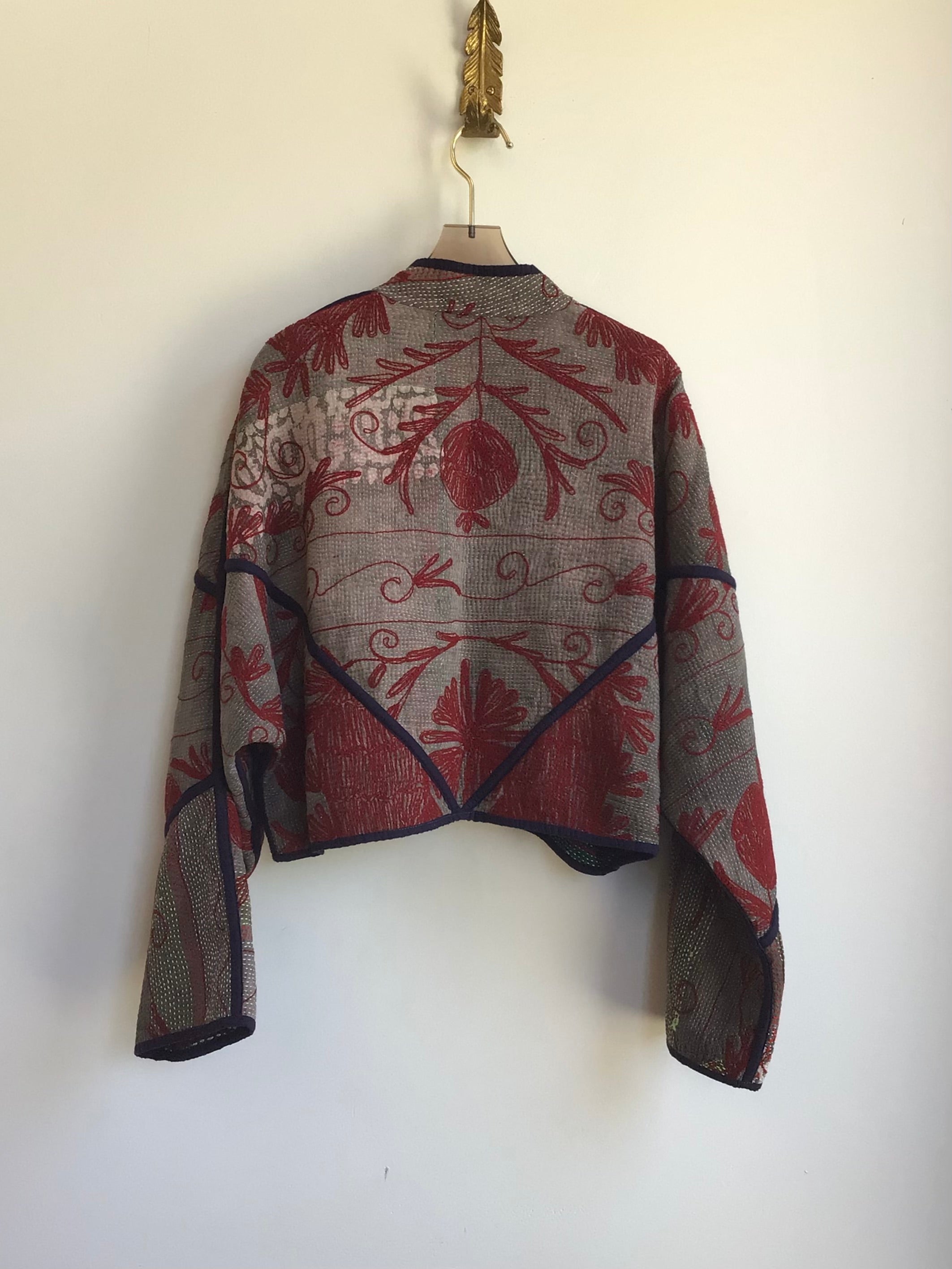 Reversible Kaira Suzani Quilted Cropped Jacket in Colors Grey, Maroon & Green, Marinara