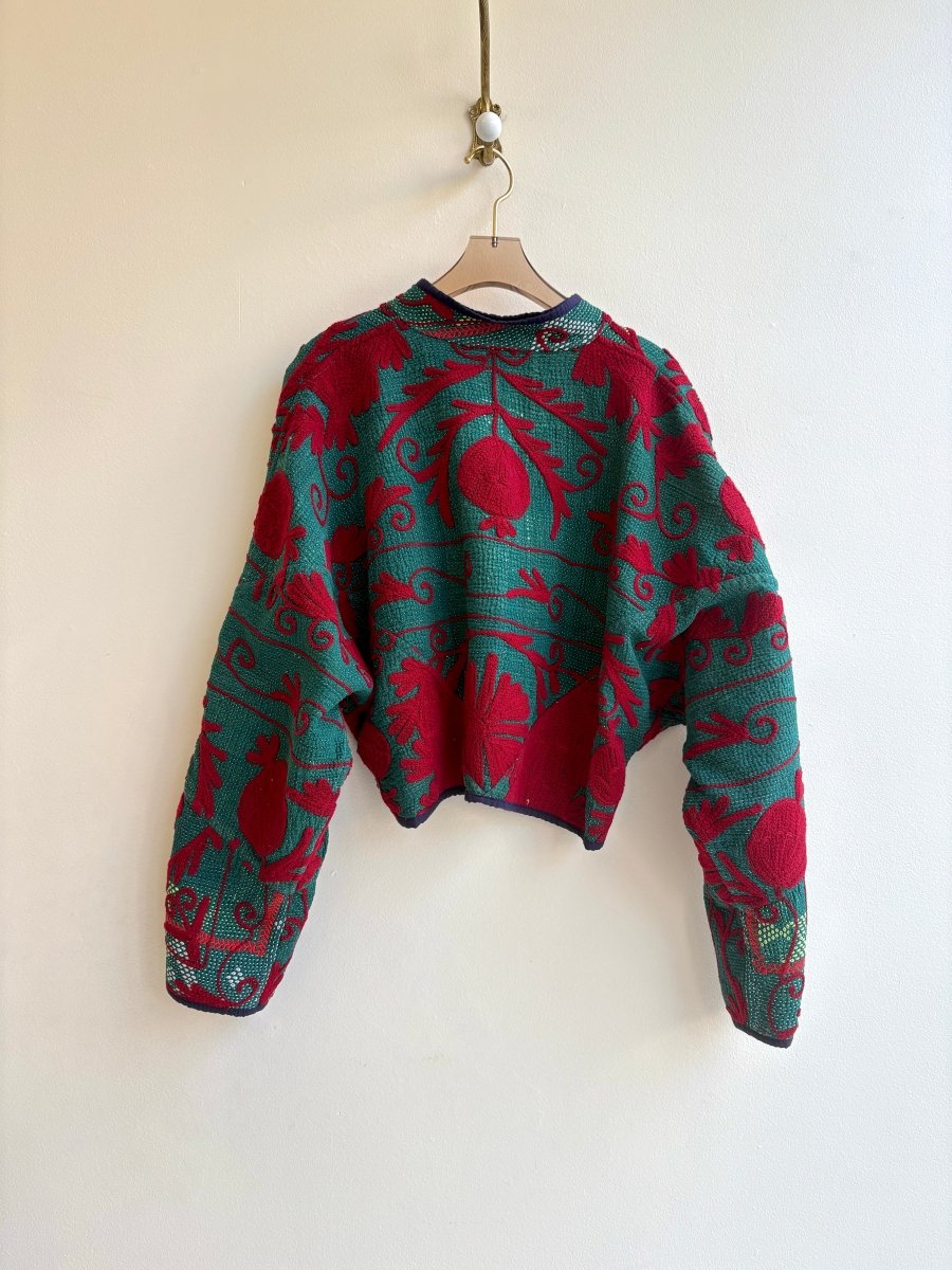 The Kaira Suzani Cropped Jacket is made from repurposed Vintage Kantha quilts, and the original patina includes areas of fraying, patches and an age-softened feel.