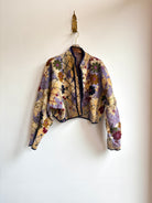 The Kaira Suzani Cropped Jacket is made from repurposed Vintage Kantha quilts, and the original patina includes areas of fraying, patches and an age-softened feel.