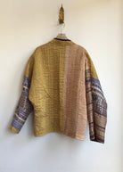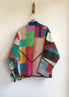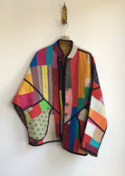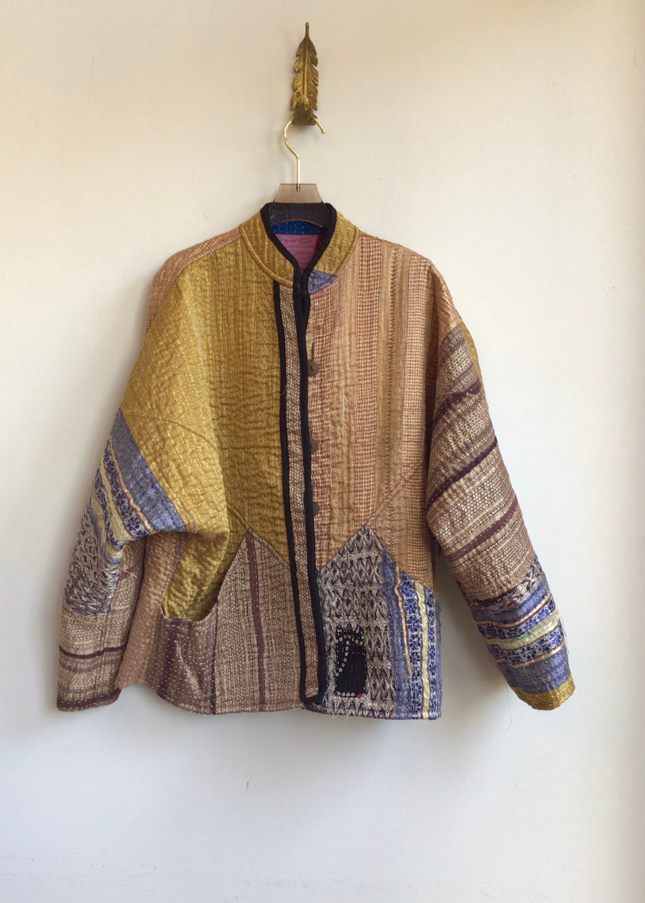 This Ladhiya Jacket is made from repurposed Vintage Kantha quilts, and the original patina includes areas of fraying, patches and an age-softened feel.