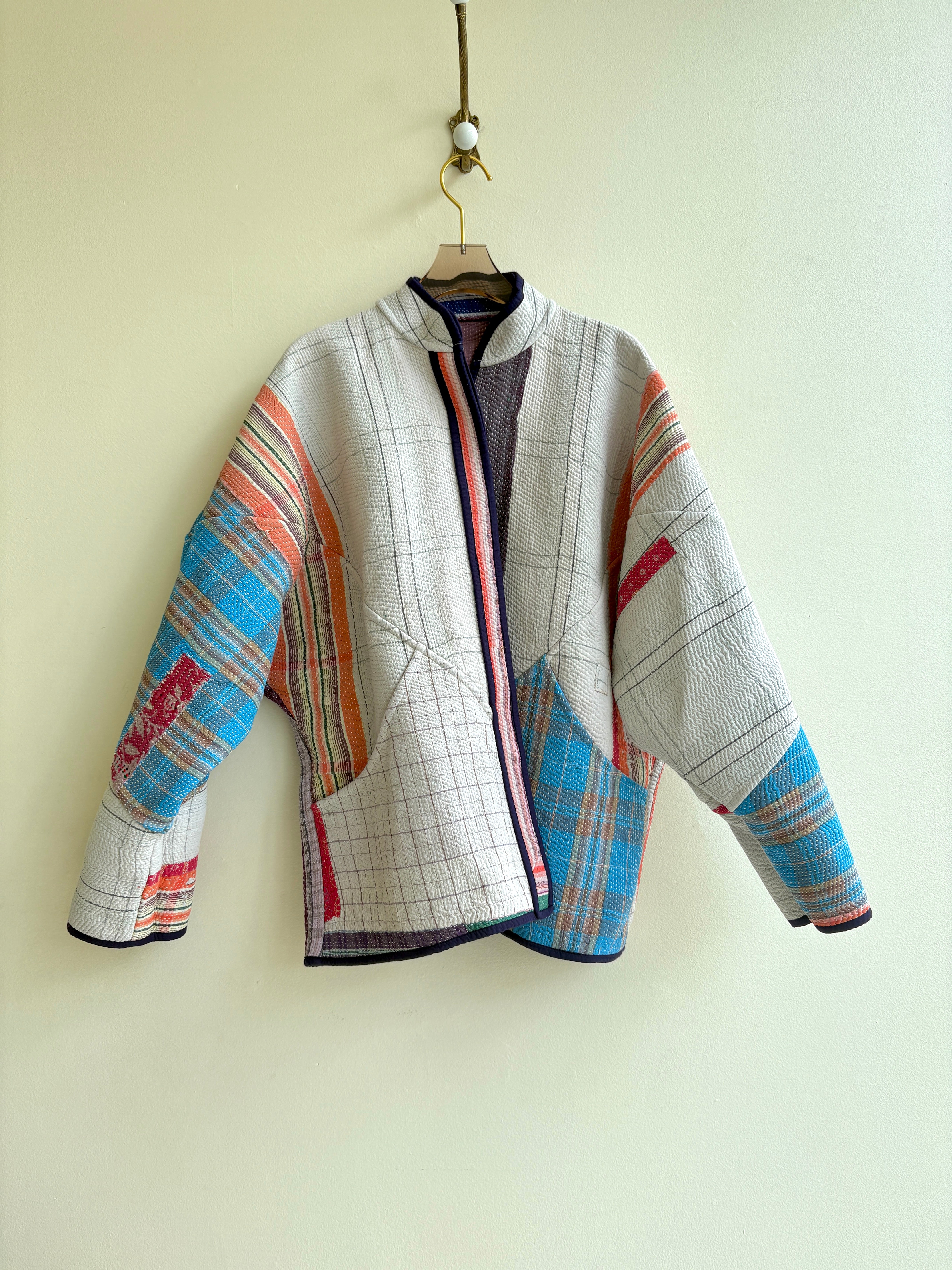 This Ladhiya Jacket is made from repurposed Vintage Kantha quilts, and the original patina includes areas of fraying, patches and an age-softened feel.