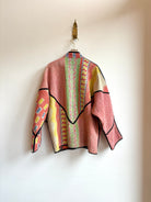 This one-of-a-kind piece features mixed prints, and block of color in contrasting colors.