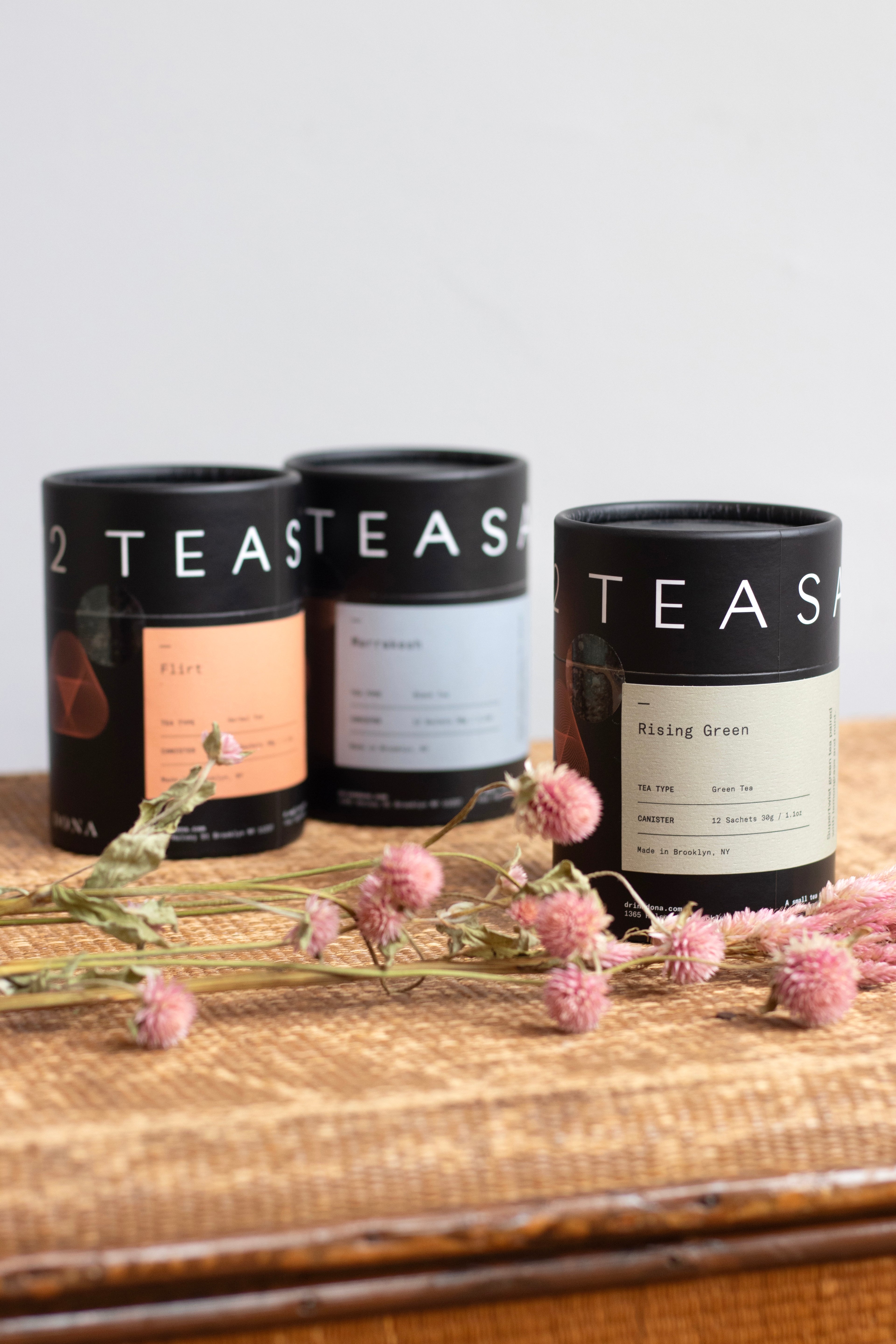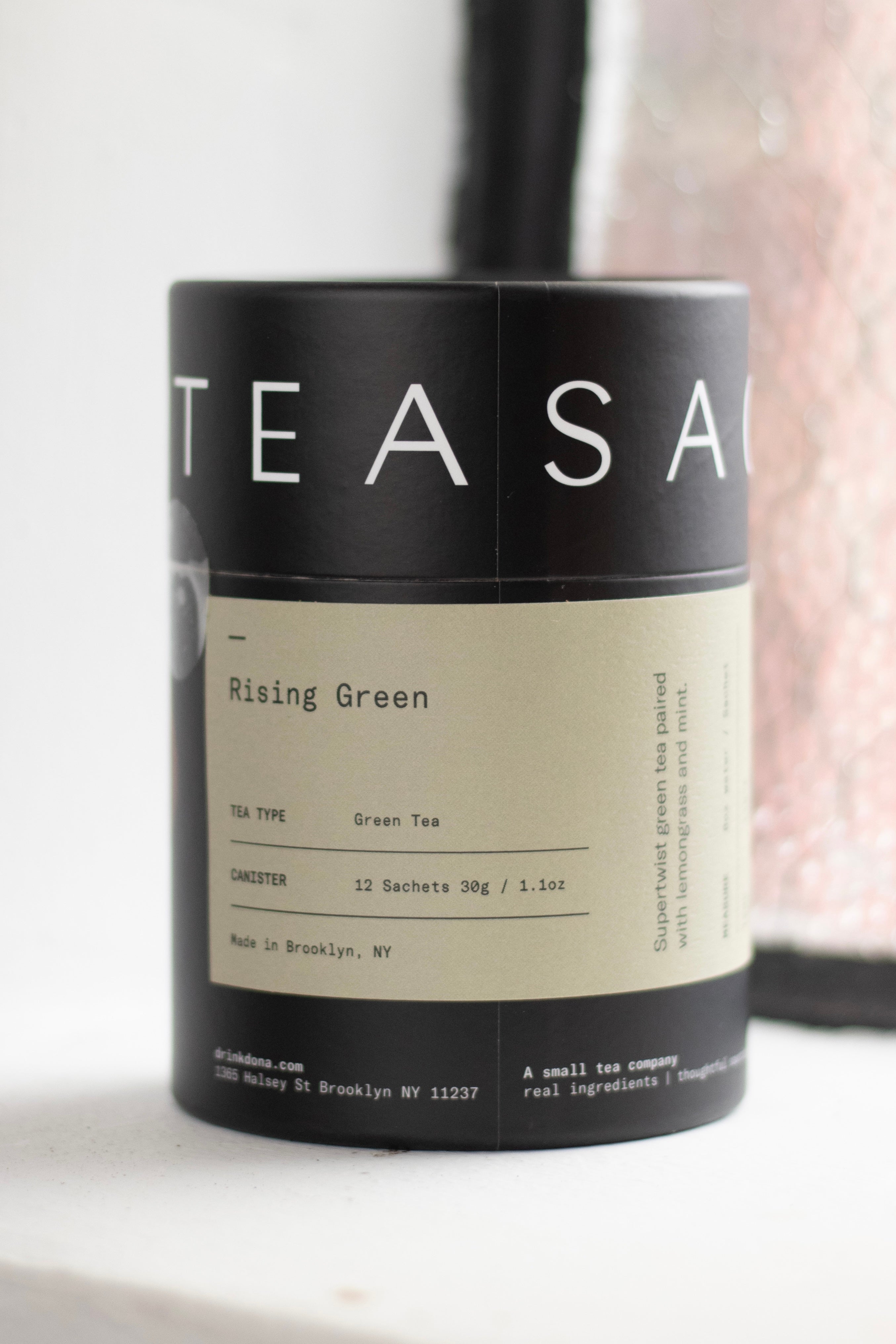 Dona Tea | Rising Green Sachets - Light, citrusy and refreshing, this whole leaf green tea sourced from the Chota Tingrai tea estate is paired with lemongrass and mint. Makes 12 cups, Size: 12 Sachets. Made in United States.