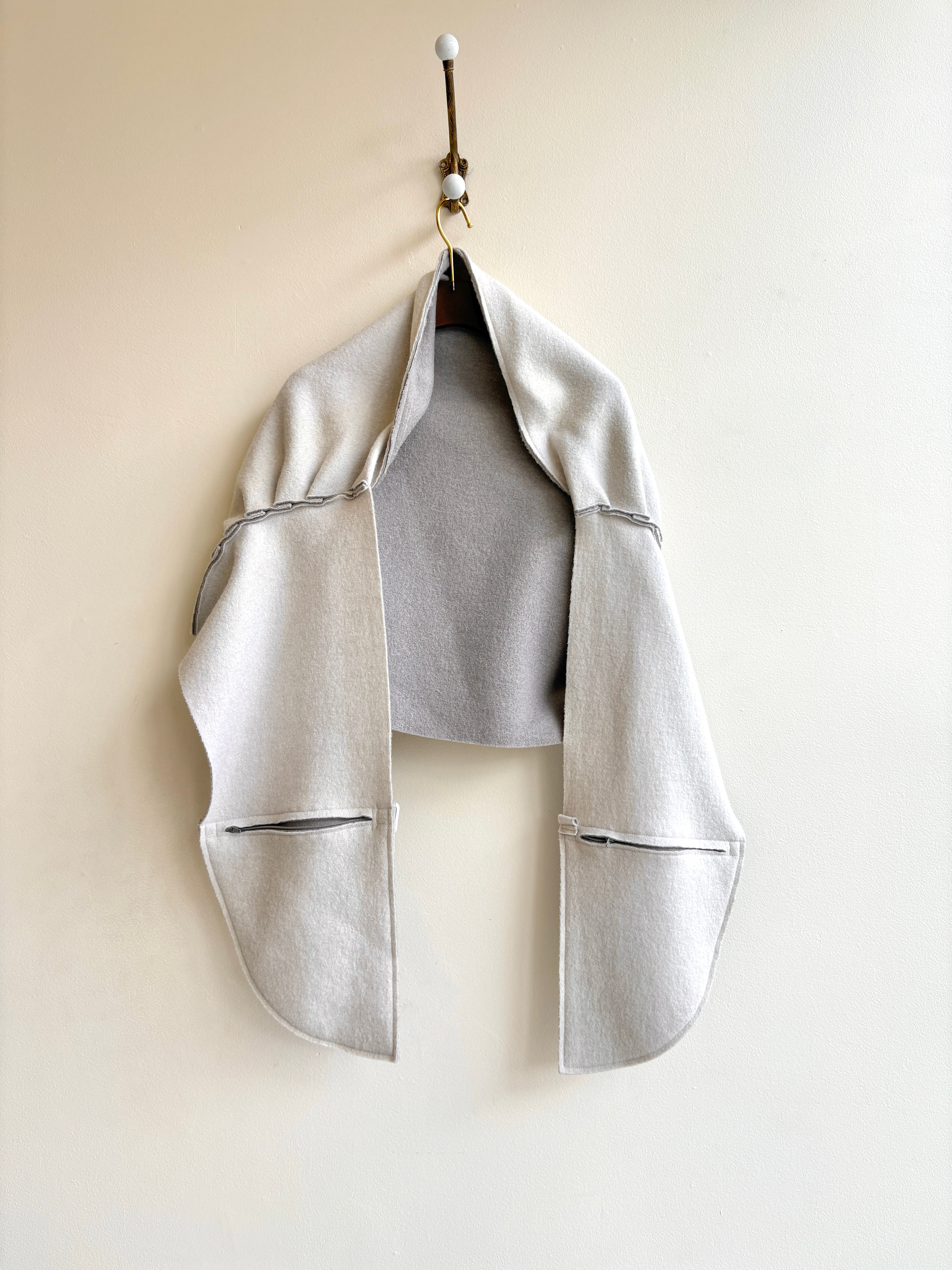 This unique baltic style shawl by Vilma Mare features her signature decorative seaming and inset pockets. Carefully constructed with a light grey wool fabric, combining ultra sleek design with classic warmth.