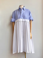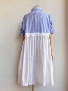 For the newest dress style for our Made X Reworked line, we’re sourcing men’s shirts from a local social-justice thrift store, Thrift2Fight, and breathing new life into them. Each design is slightly different and of course starts with a different shirt. This one combines a blue men’s button-down in a windowpane plaid with white cotton shirting for a full-skirted shirtwaist shirtdress with an empire waistline.