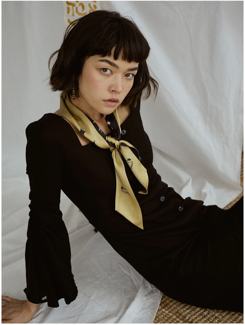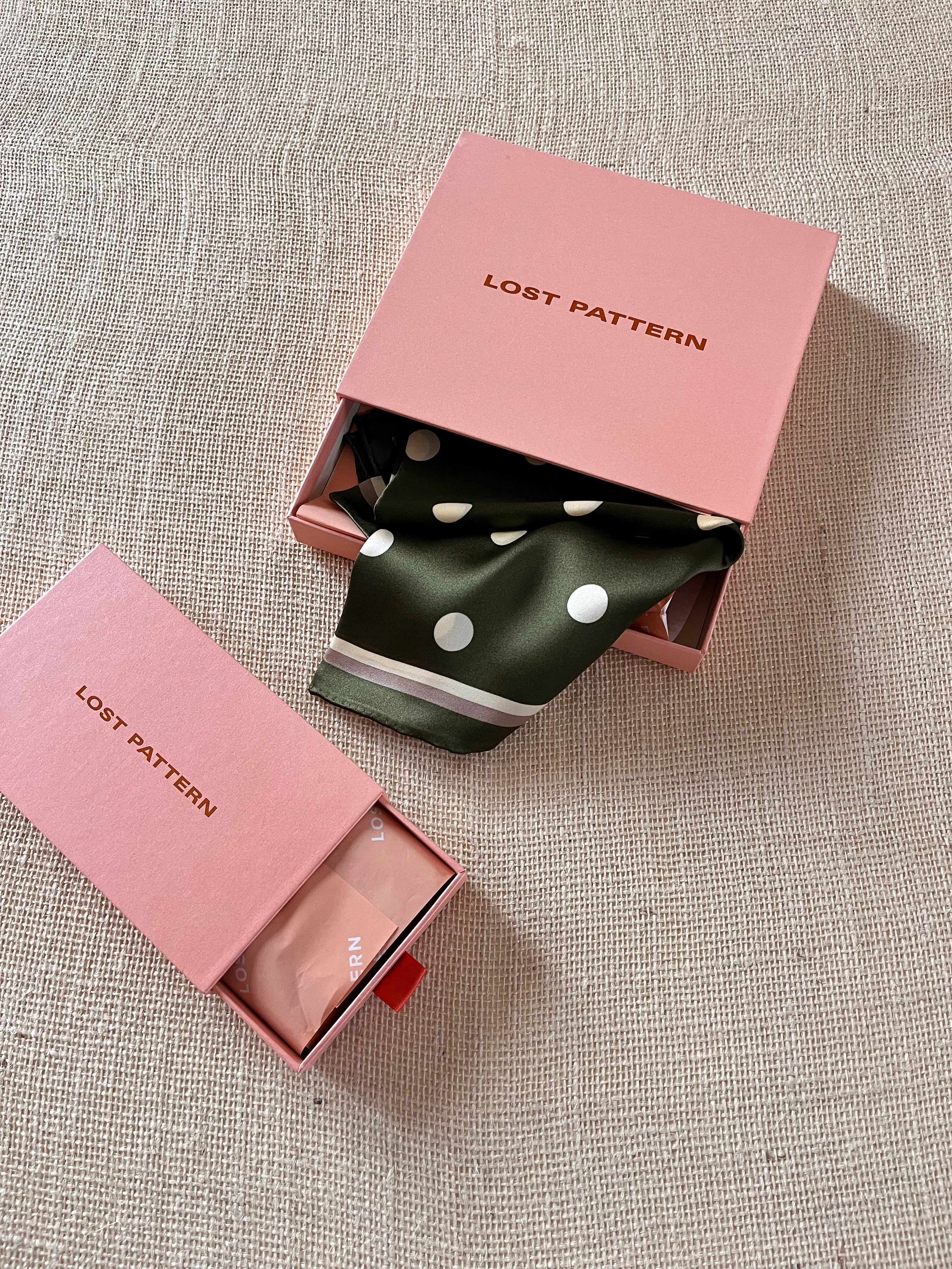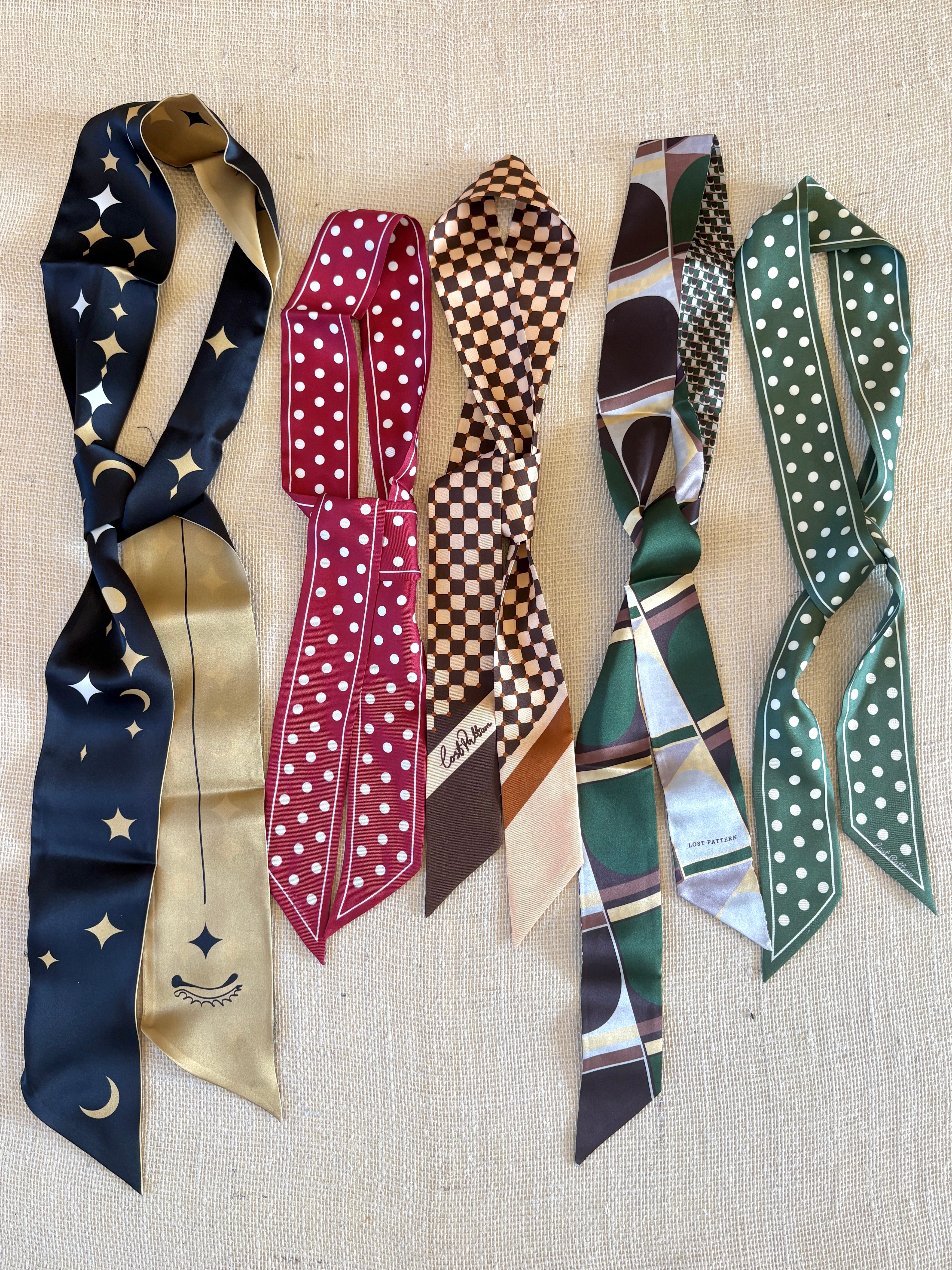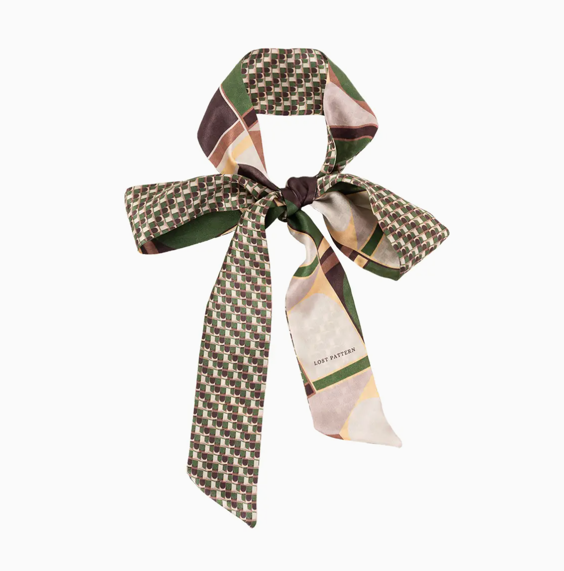 Draped around the shoulders, worn tied up as an ascot, or used as a hair scarf, these sleek silk scarves by Lost Pattern are an effortless addition to any look, day or night.