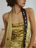 Its elegant moon and stars design makes it effortlessly stylish, whether worn as a neck scarf, hair scarf, draped around the neck, or tied to a bag for a touch of cosmic charm. This is the largest skinny scarf, making it an extremely versatile accessory.