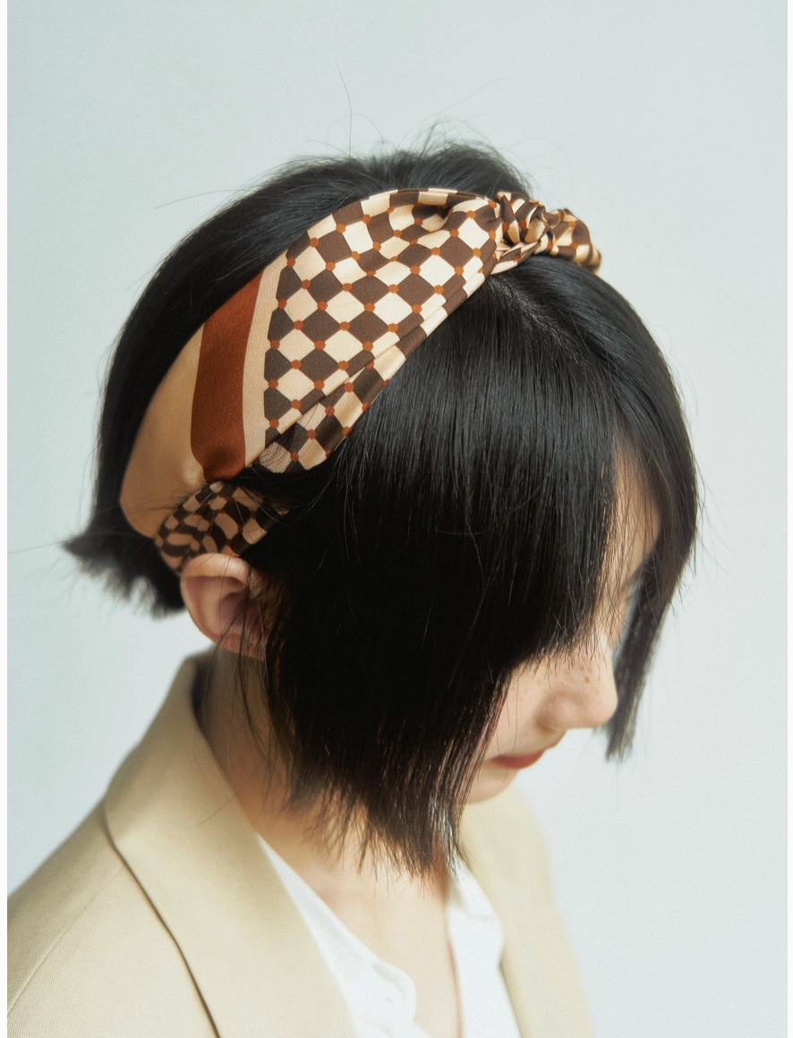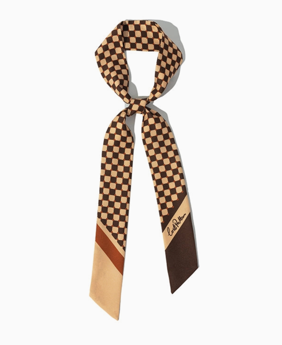 This skinny scarf made of 100% silk twill is soft and light, the mod coffee checkerboard pattern pairs well with autumnal tones.