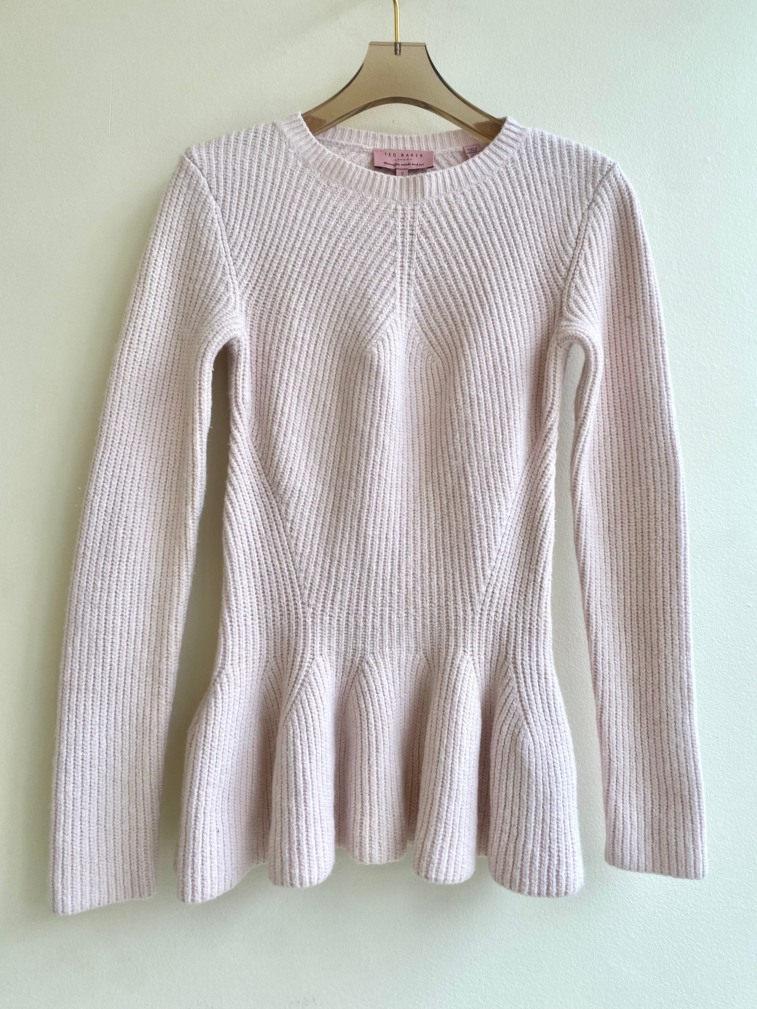 Crafted with the signature quality of Ted Baker, this pale pink top features a flattering peplum design. Elevate your style and stay cozy with this must-have sweater top.