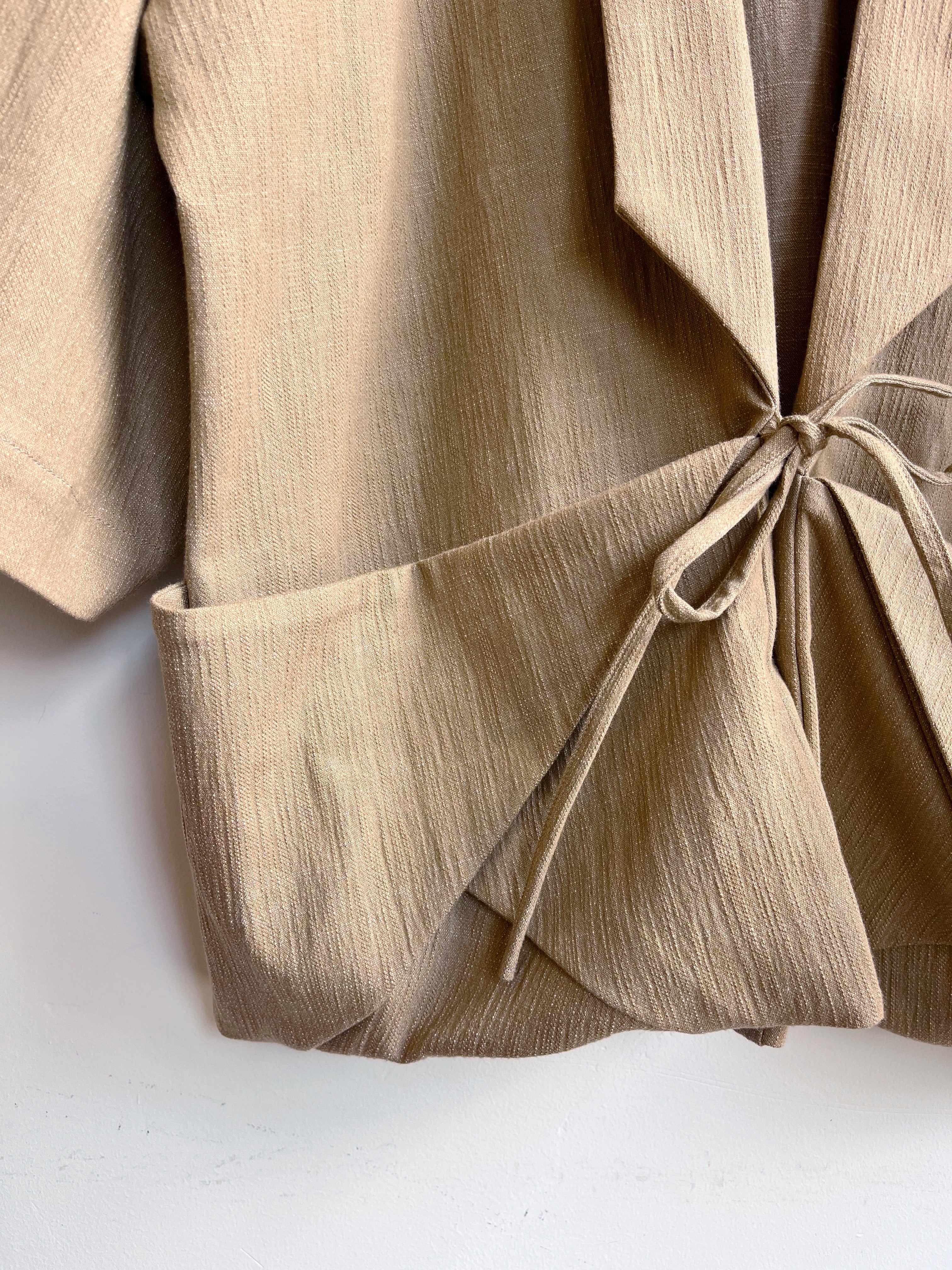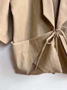 With its easy fit, distinctive pockets, folded lapel and front ties, our unisex Chore Jacket is a versatile statement piece that can be worn as outerwear or as you would a blazer or cardigan. This one was sewn from an elegant textured khaki fabric.