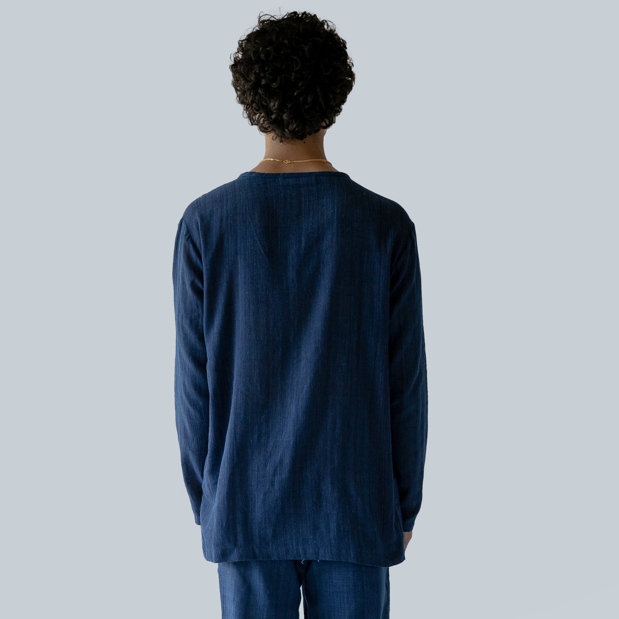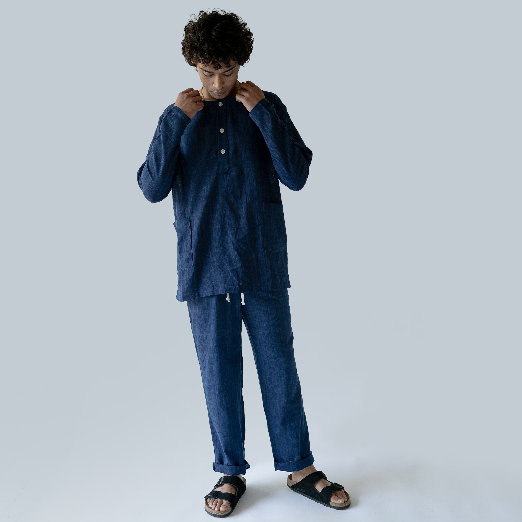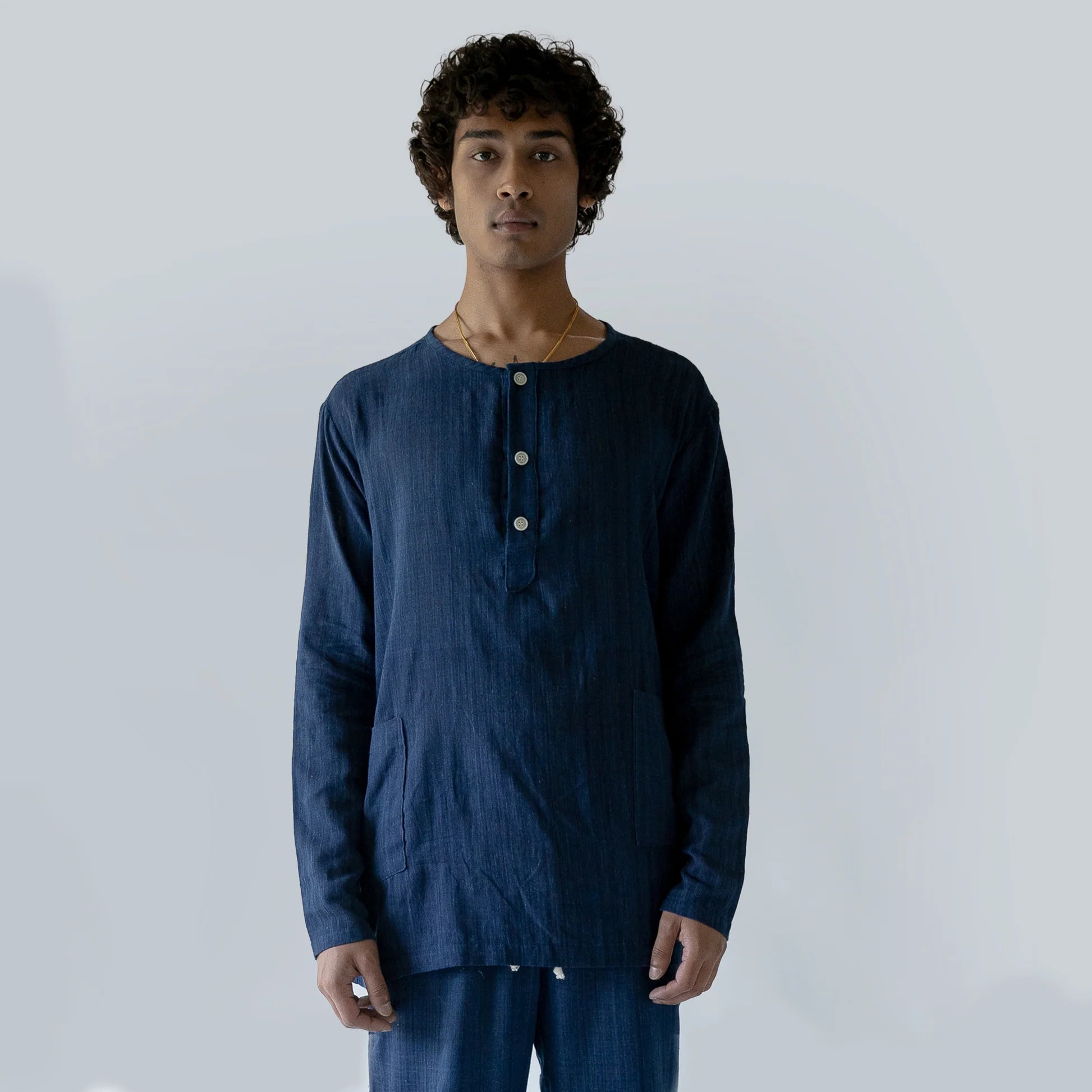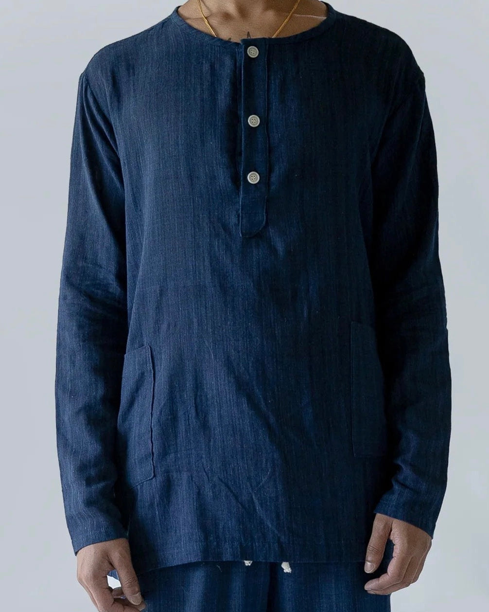 This Baniyan shirt is crafted with Indian Khadi made of 100% cotton, lovingly handwoven by artisans in India. For durability, it has Italian Urea buttons with a distressed finish and French seams. Exclusively made in USA. Designed in Queens, NY.