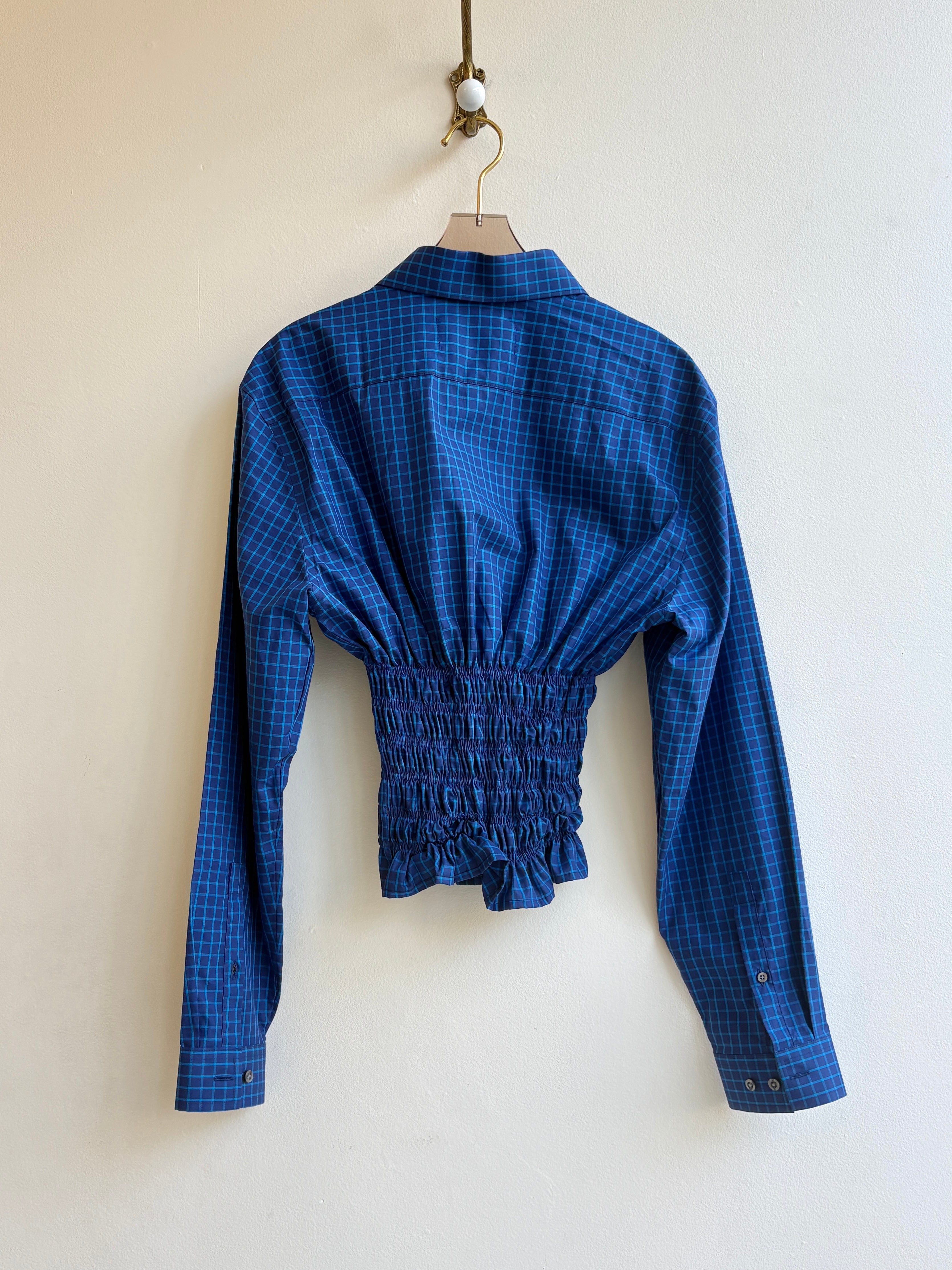 The George Top | Navy & Electric Blue Plaid Button Down Top w/ Smocked Waist (Reworked)