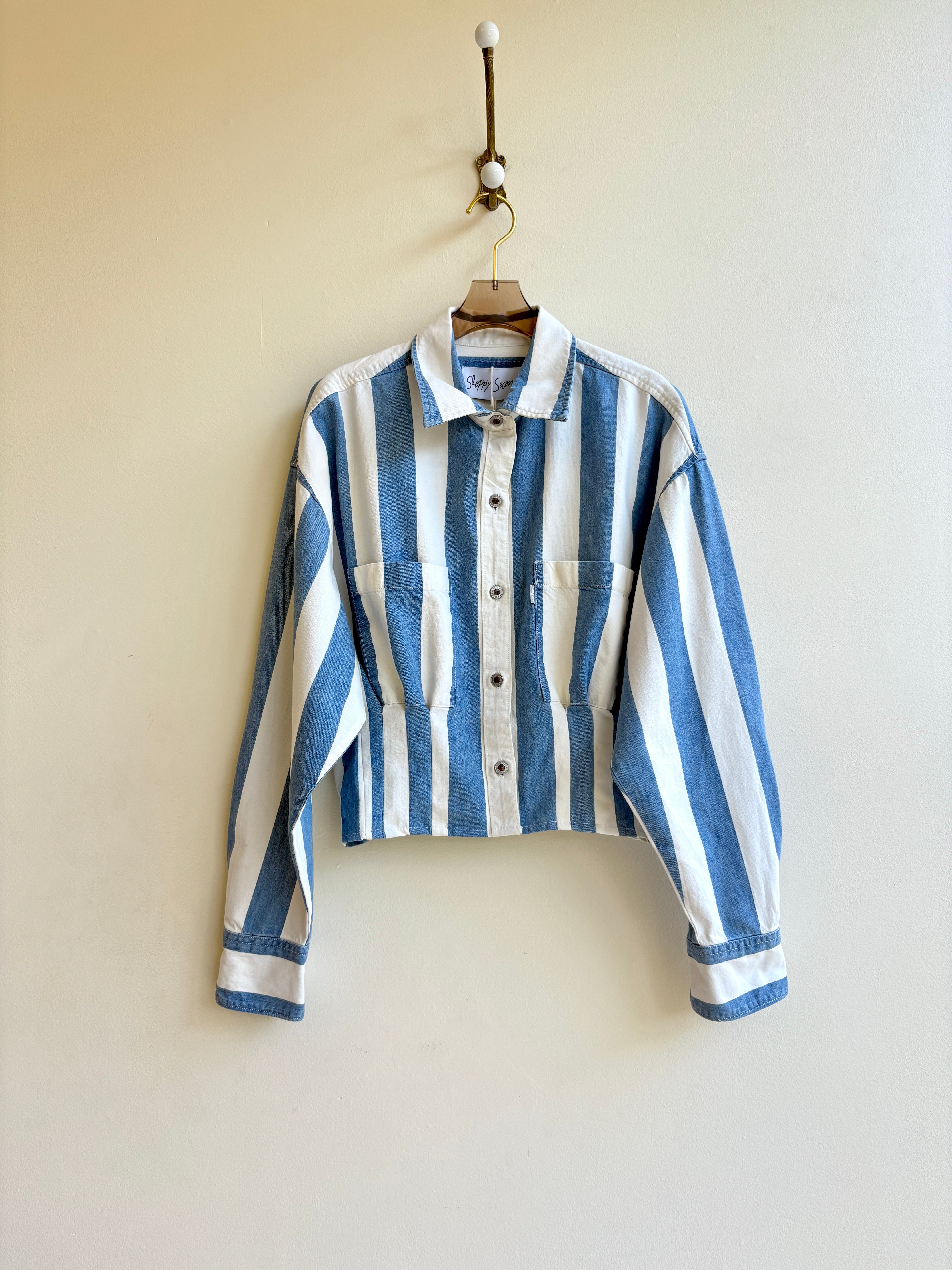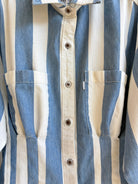 The Kevin Top | Blue & White Wide Stripe Denim Top w/ Gathered Waist (Reworked)
