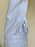 - Brown, blue & white stripe print with white buttons