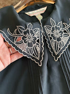 - Black with white floral pattern embroidery on lace tipped Peter Pan collar, black embroidery touches on sleeve cuff