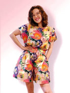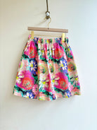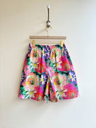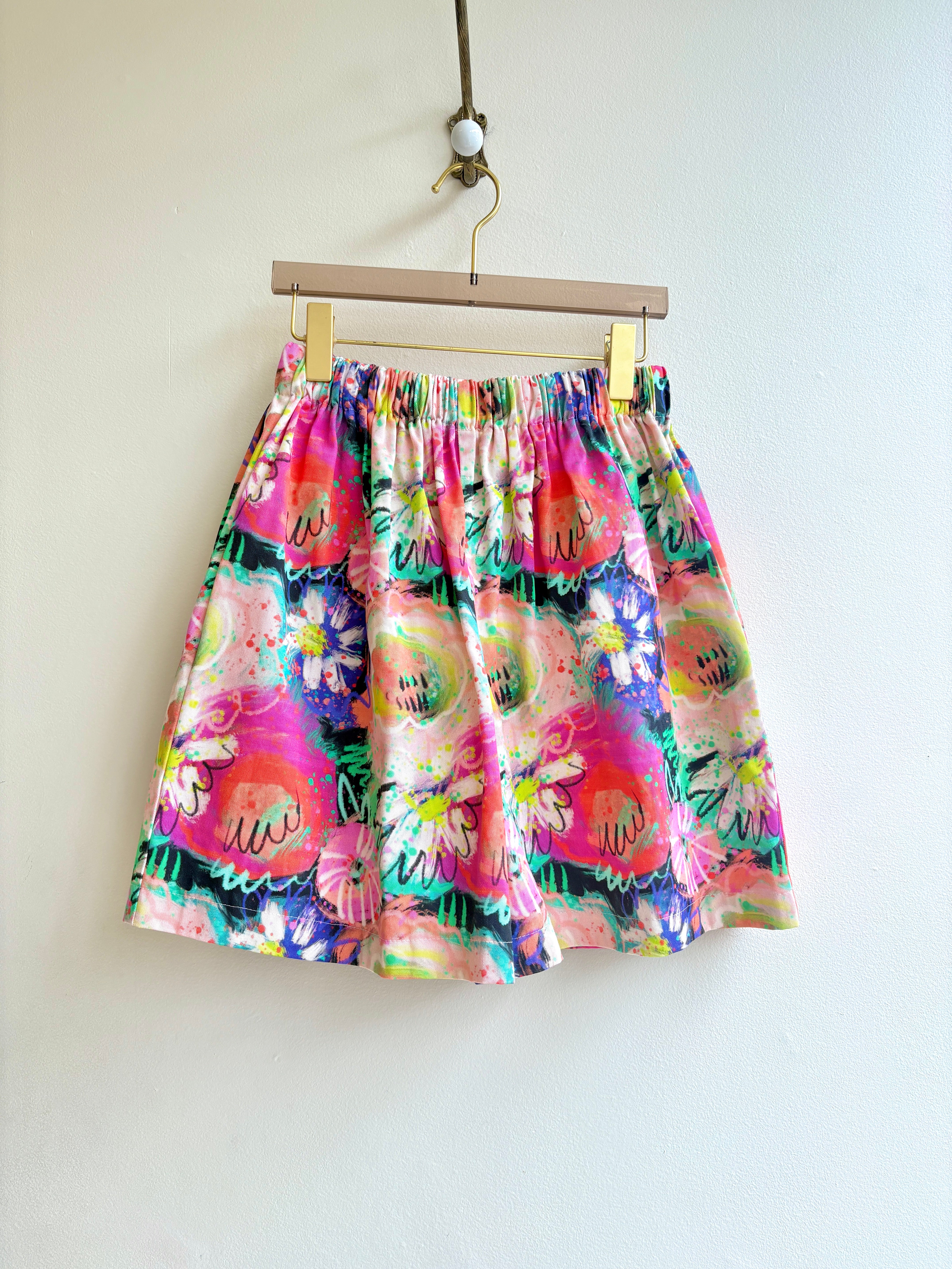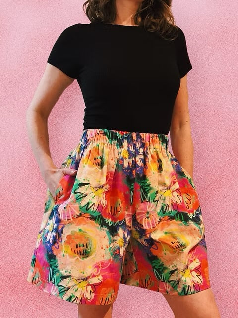 Retro style, high-waist shorts in a woven cotton twill custom printed from Spoonflower. Cut full and wide to look like a skirt, but oh so comfortable and practical! Wide gathered elastic waist and hidden inseam pockets make these an easy summer go-to!