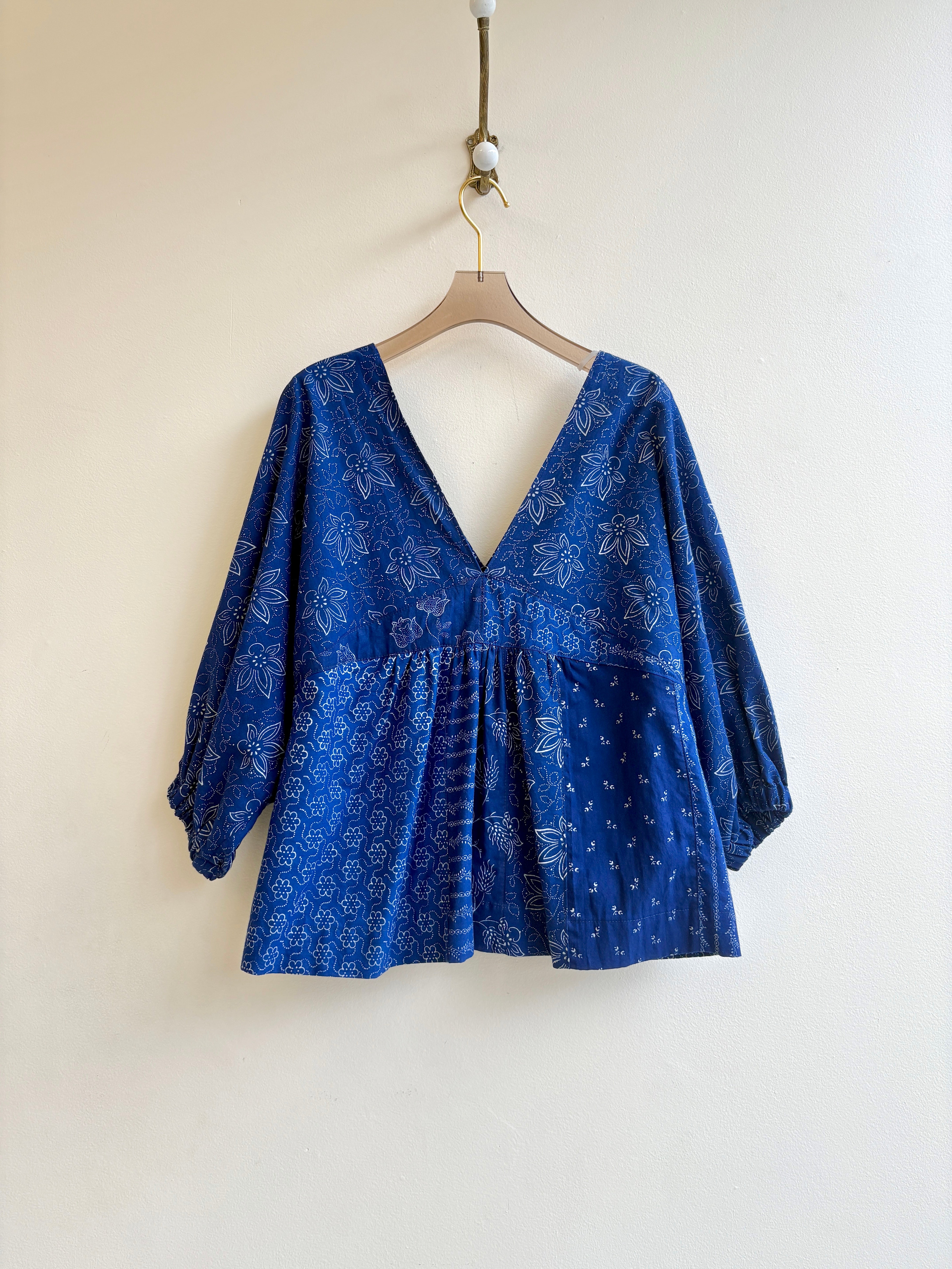 Zero Waste Blue Cotton Ruffle Top w/ Handstamped Floral Motif