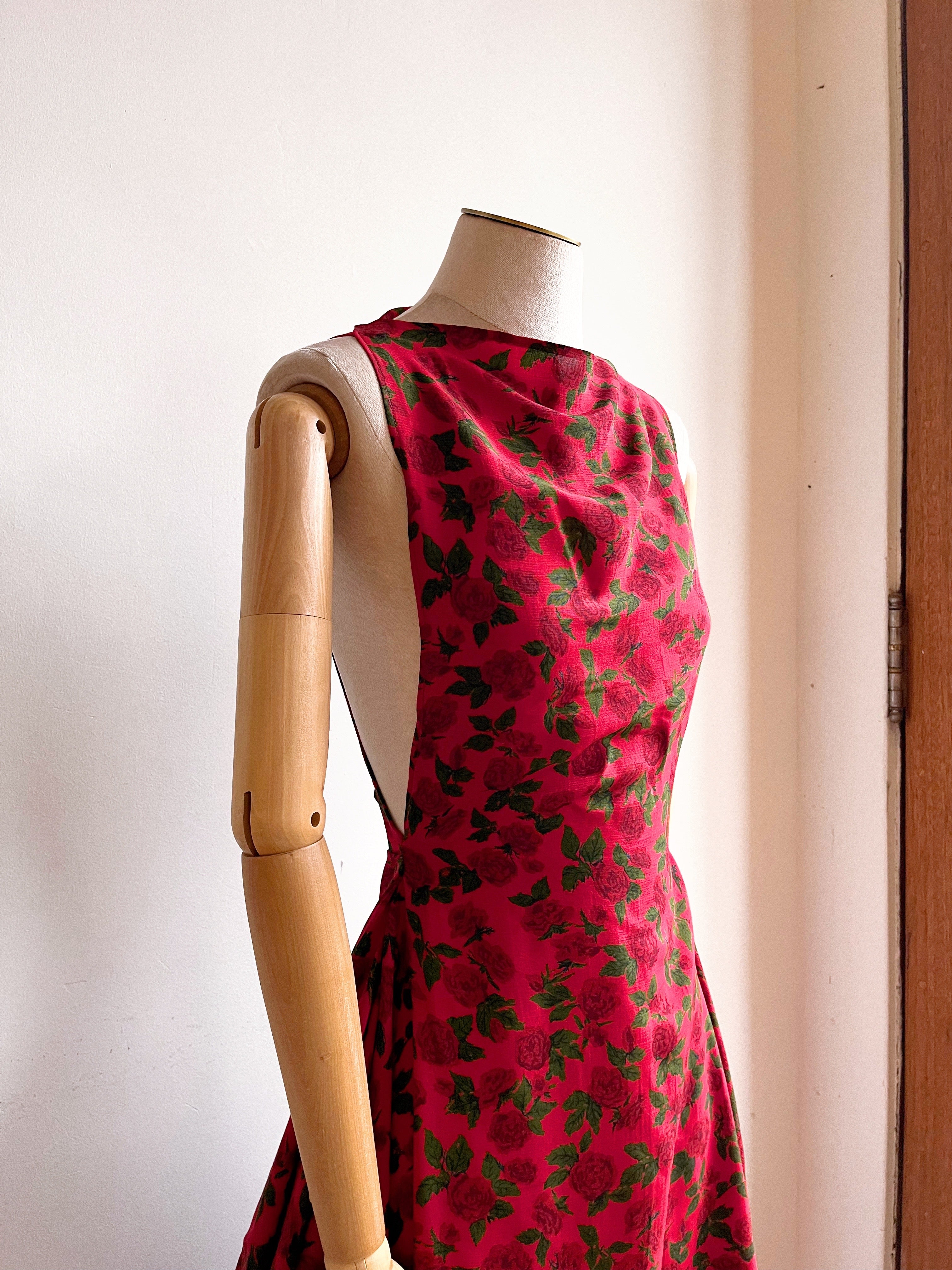 Zero-waste design means not an inch this stunning red floral fabric was wasted. Instead the vintage textile has become a stunning party dress for this or any season.